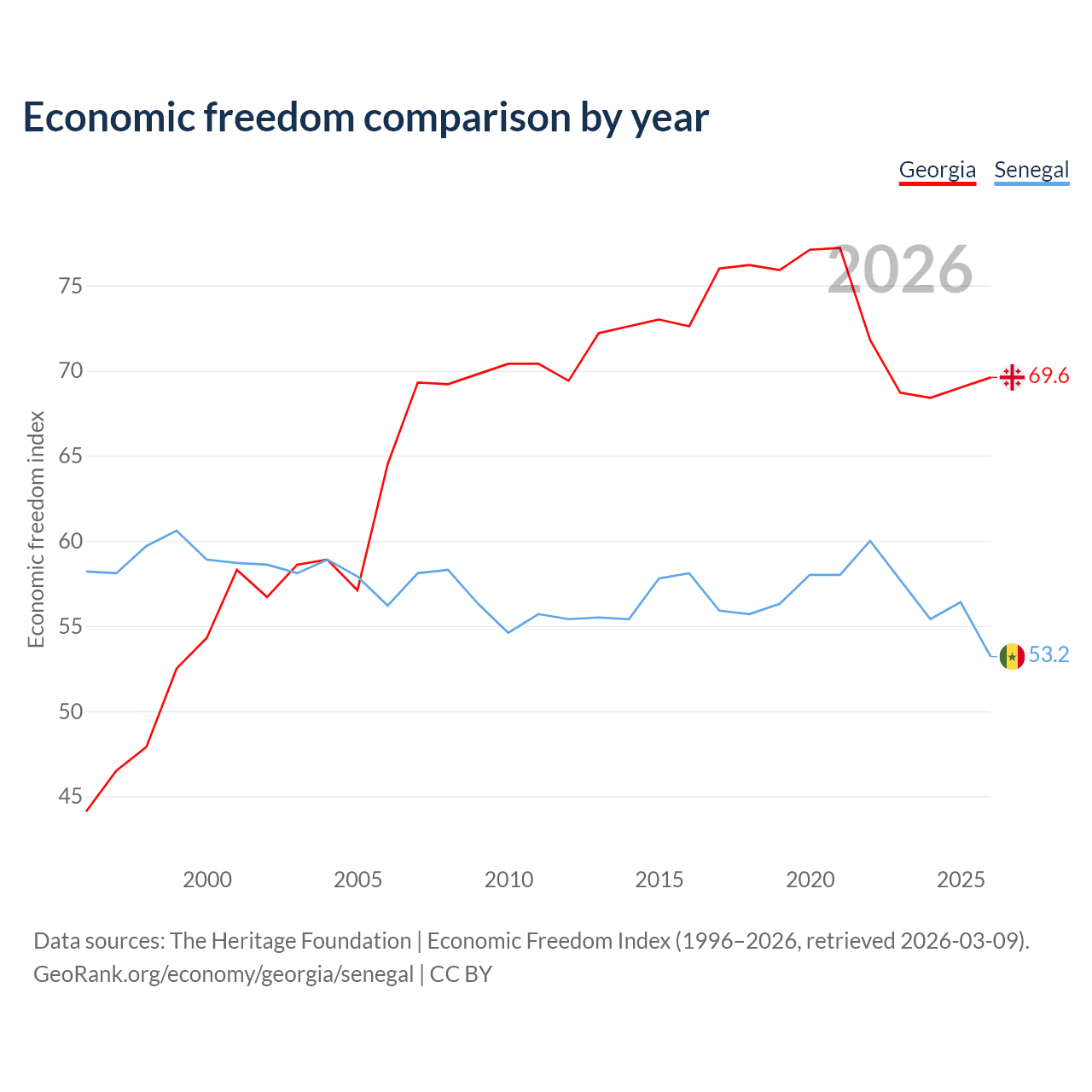 The Economic Freedom Index for Georgia is 69.6, ranking 41/197, compared to 53.2 for Senegal, ranking 140/197. The chart above displays a comparison of annual changes in economic freedom indexes.