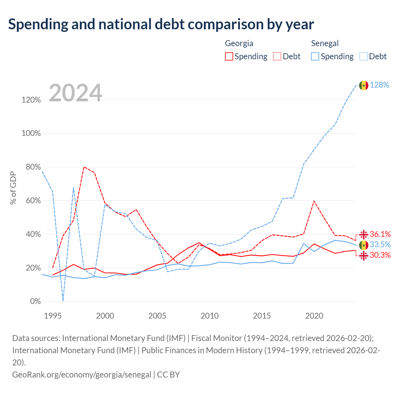 Georgia has $12.3B in government debt (36.1% of GDP), compared to $42.1B (128.4% of GDP) in Senegal.