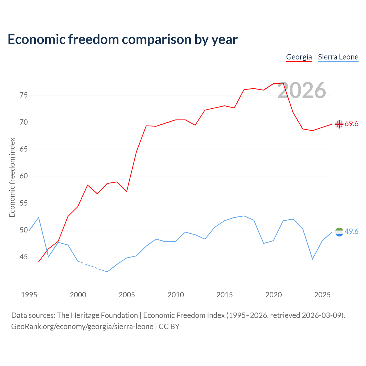 The Economic Freedom Index for Georgia is 69.6, ranking 41/197, compared to 49.6 for Sierra Leone, ranking 165/197. The chart above displays a comparison of annual changes in economic freedom indexes.
