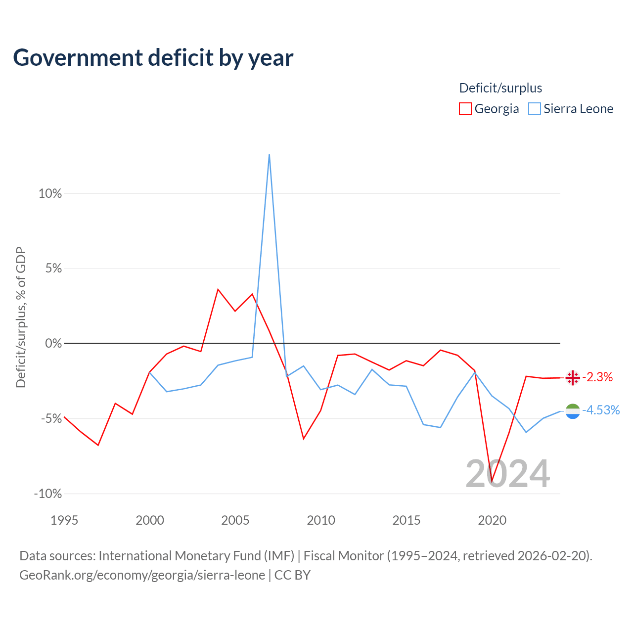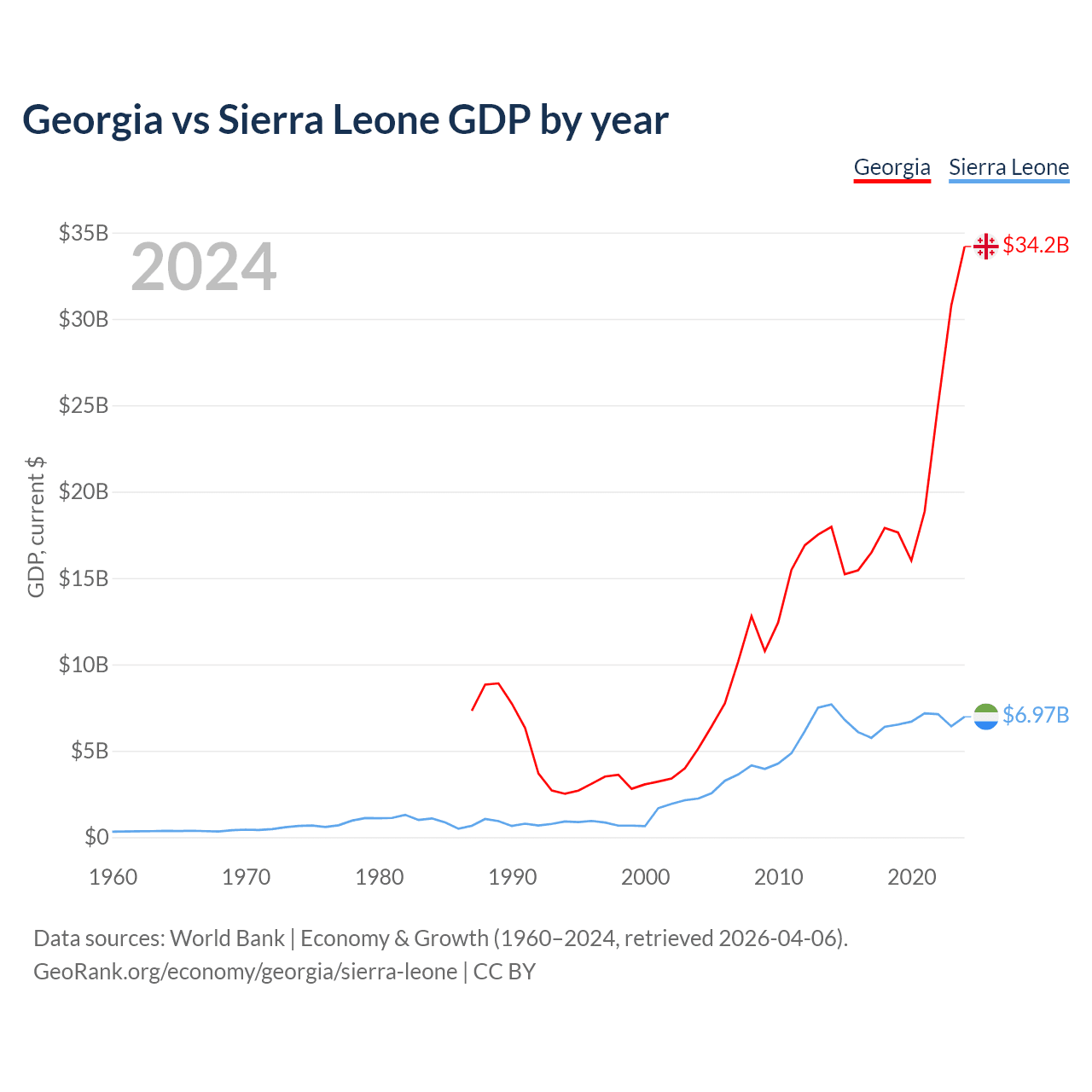 Georgia has a GDP of $34.2B compared to $6.97B for Sierra Leone, ranking 107/197 and 160/197 by economy size, respectively.