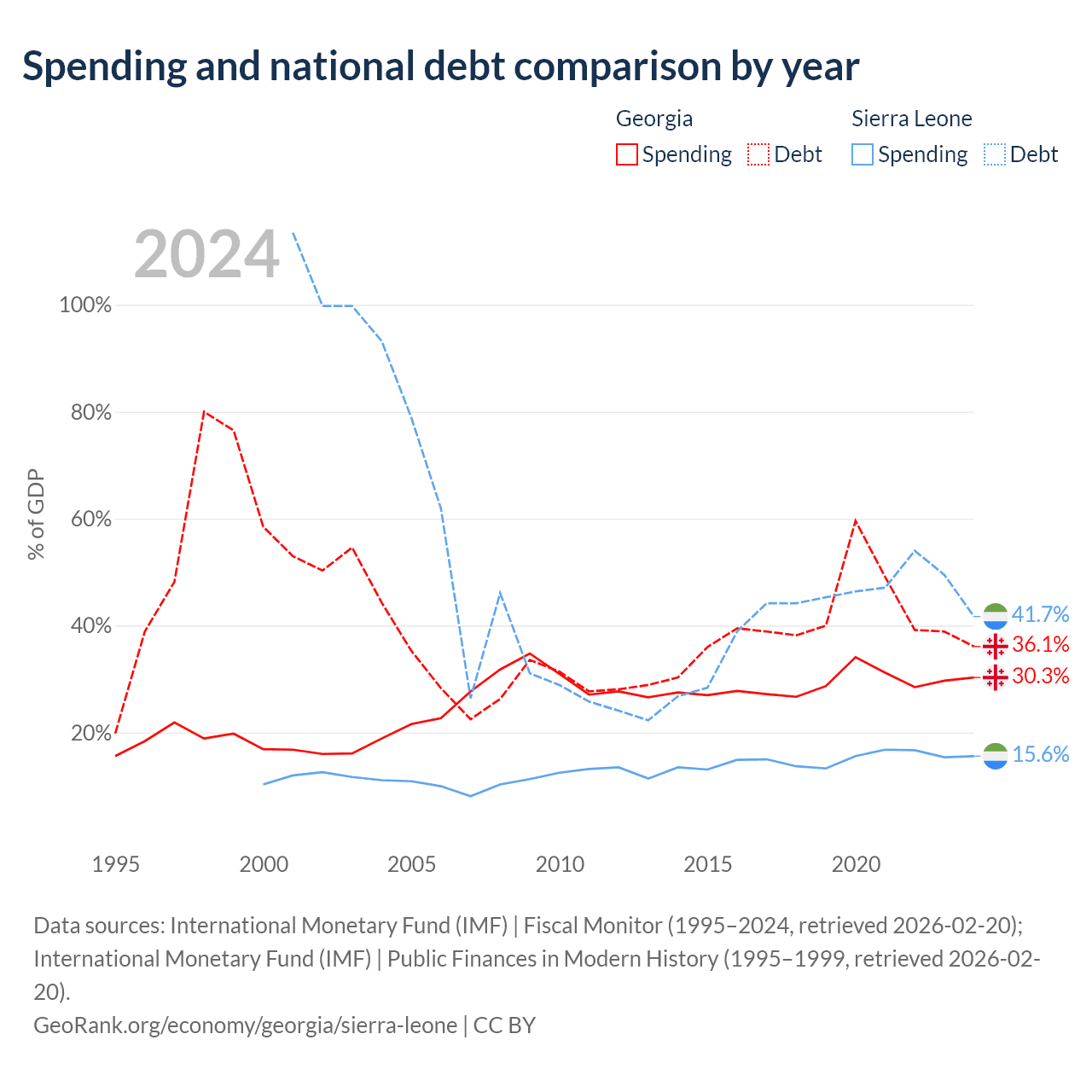 Georgia has $12.3B in government debt (36.1% of GDP), compared to $2.91B (41.7% of GDP) in Sierra Leone.