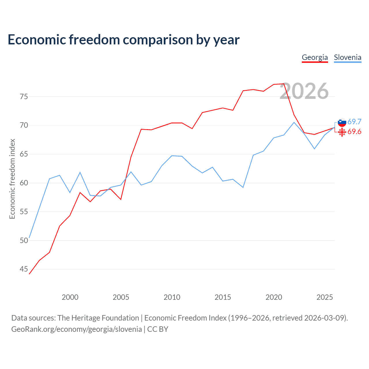 The Economic Freedom Index for Georgia is 69.6, ranking 41/197, compared to 69.7 for Slovenia, ranking 40/197. The chart above displays a comparison of annual changes in economic freedom indexes.