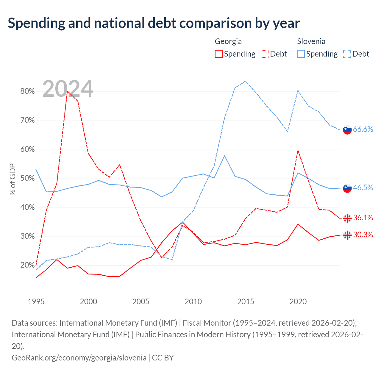 Georgia has $12.3B in government debt (36.1% of GDP), compared to $48.6B (66.6% of GDP) in Slovenia.