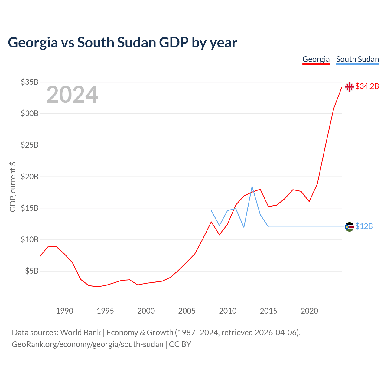 Georgia has a GDP of $34.2B compared to $12B for South Sudan, ranking 107/197 and 149/197 by economy size, respectively.