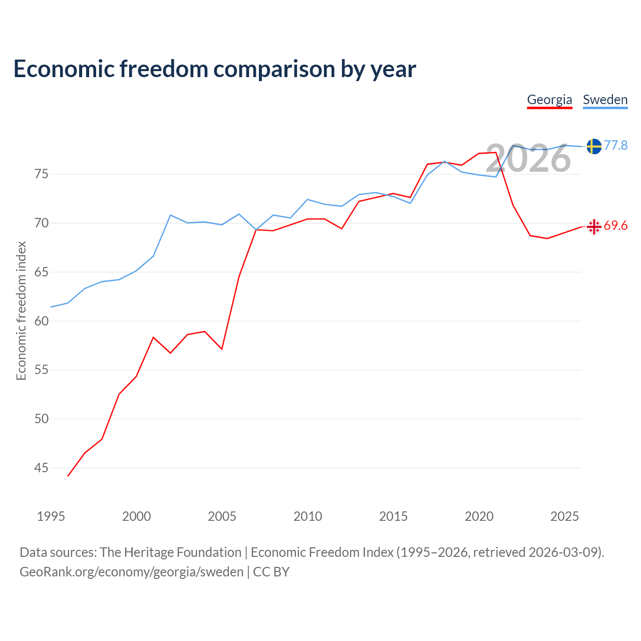 The Economic Freedom Index for Georgia is 69.6, ranking 41/197, compared to 77.8 for Sweden, ranking 14/197. The chart above displays a comparison of annual changes in economic freedom indexes.