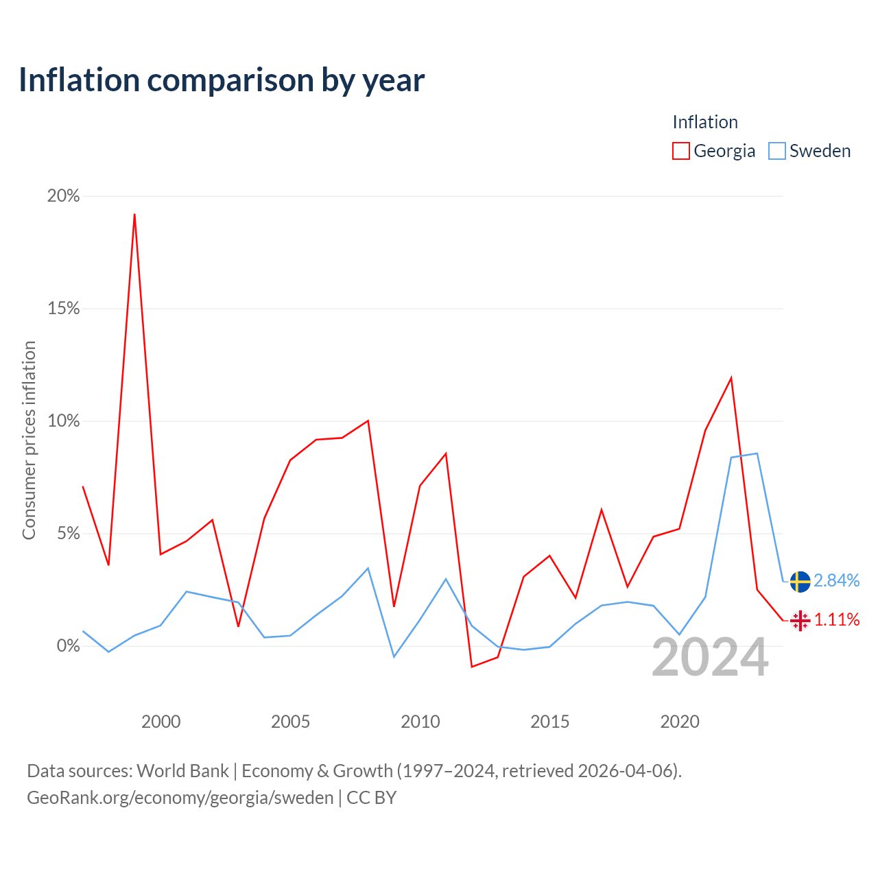 Georgia has a GDP of $34.2B compared to $604B for Sweden, ranking 107/197 and 26/197 by economy size, respectively.