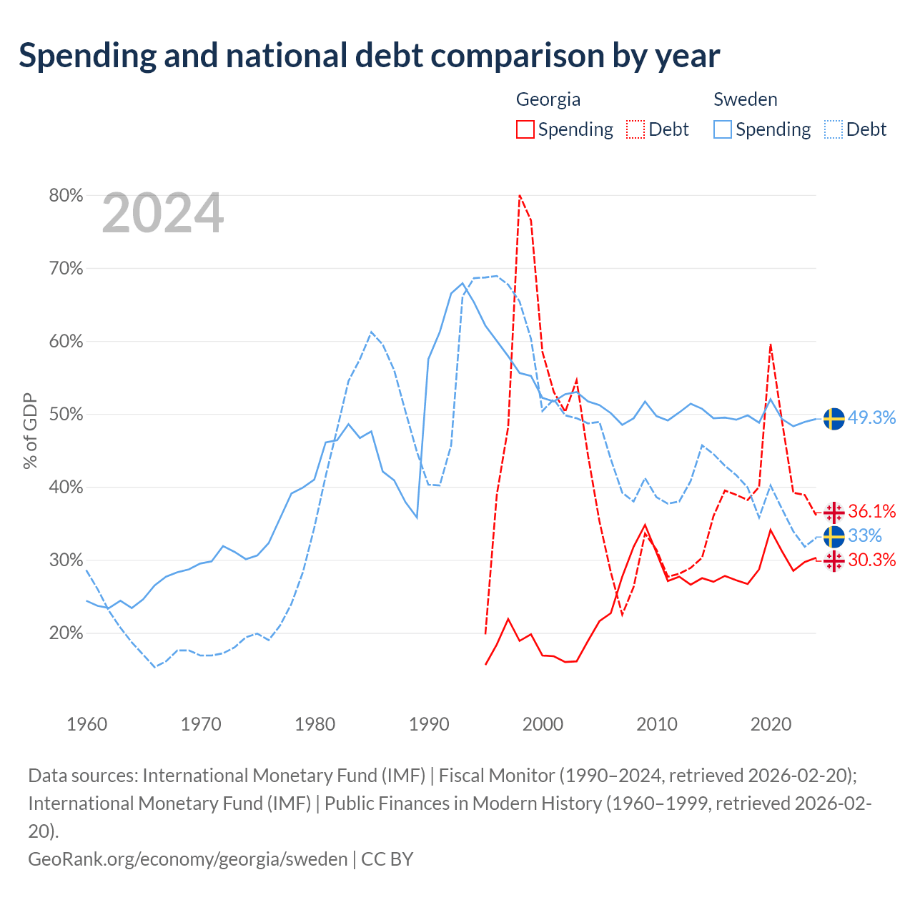 Georgia has $12.3B in government debt (36.1% of GDP), compared to $199B (33% of GDP) in Sweden.