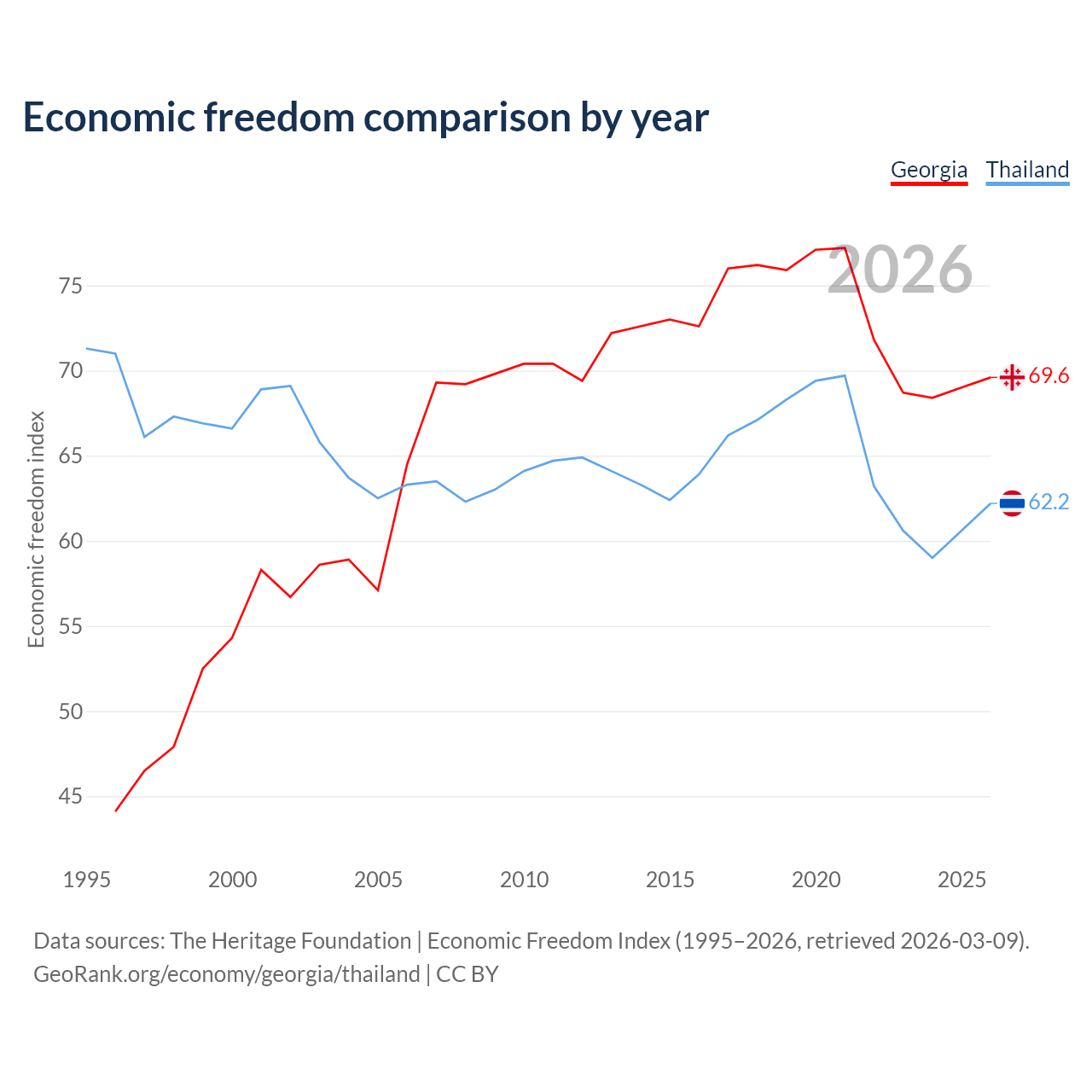 The Economic Freedom Index for Georgia is 69.6, ranking 41/197, compared to 62.2 for Thailand, ranking 88/197. The chart above displays a comparison of annual changes in economic freedom indexes.