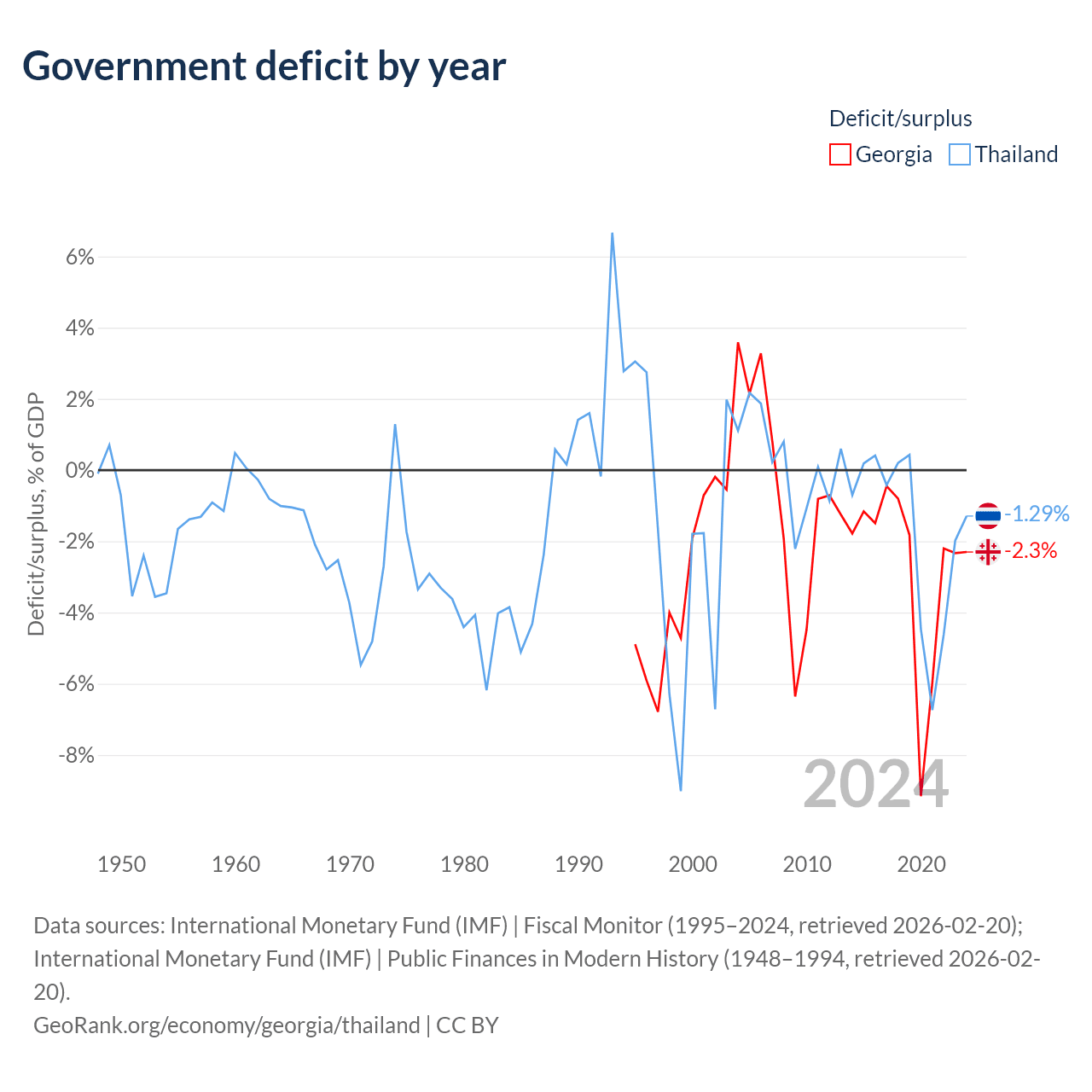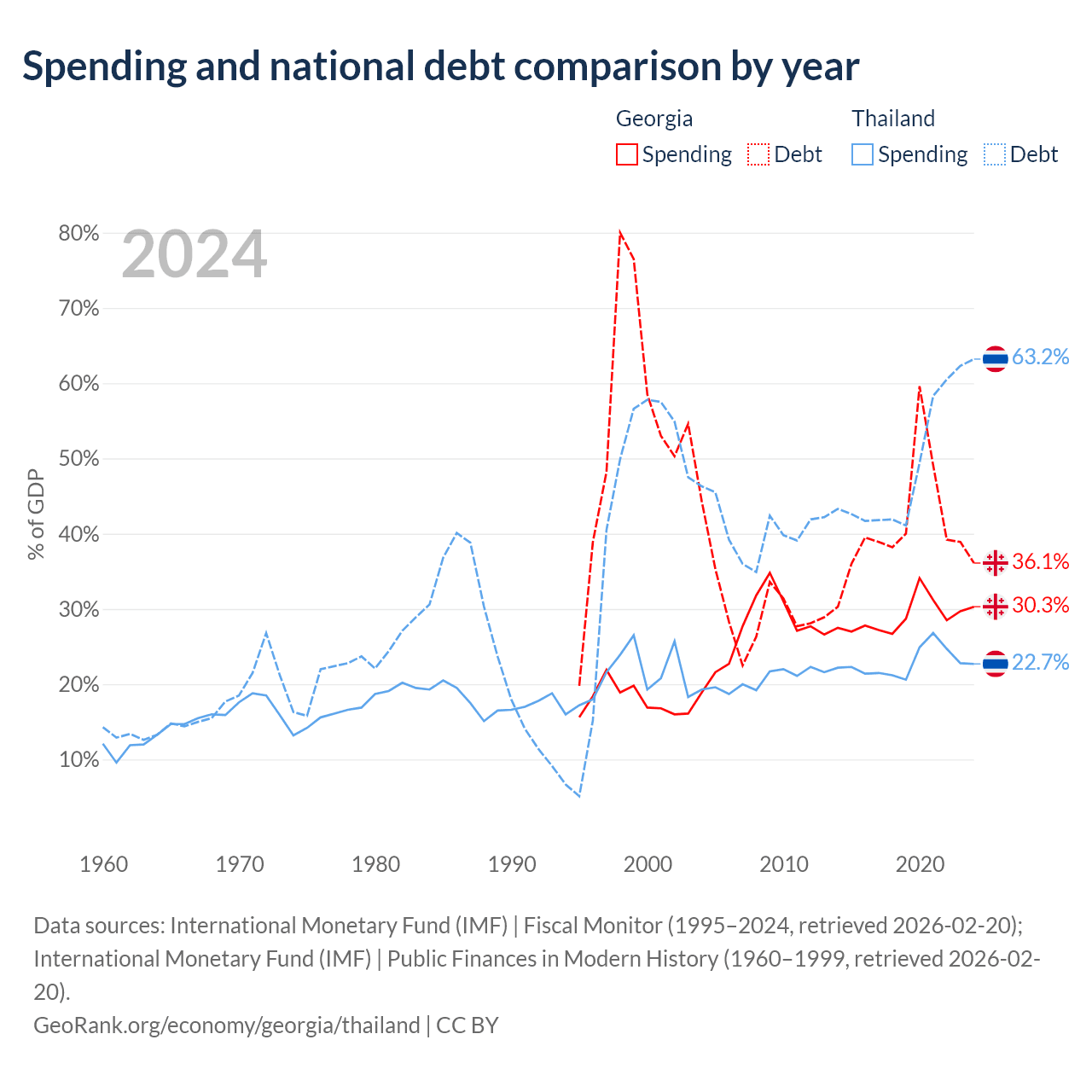 Georgia has $12.3B in government debt (36.1% of GDP), compared to $333B (63.2% of GDP) in Thailand.