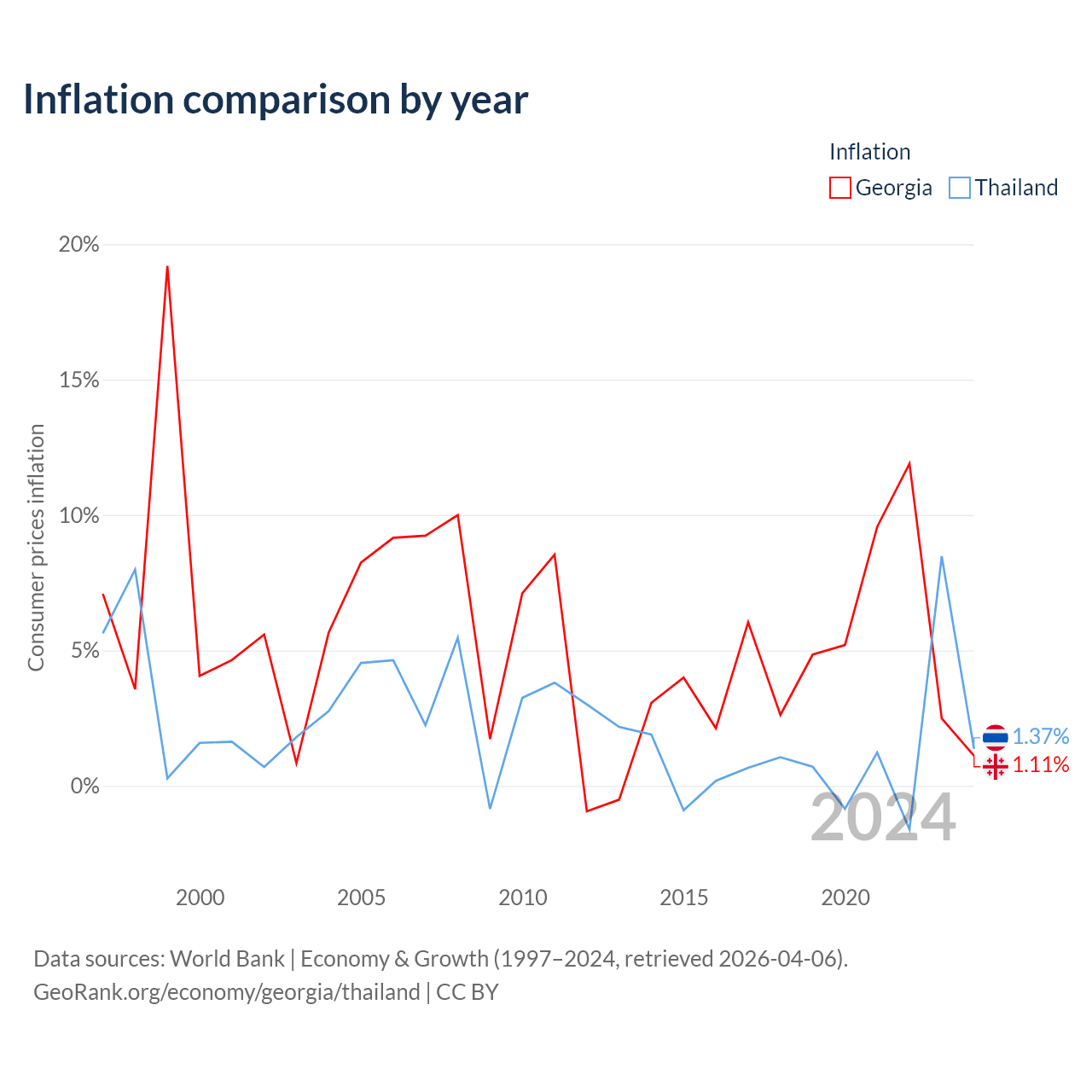 Georgia has a GDP of $34.2B compared to $527B for Thailand, ranking 107/197 and 31/197 by economy size, respectively.