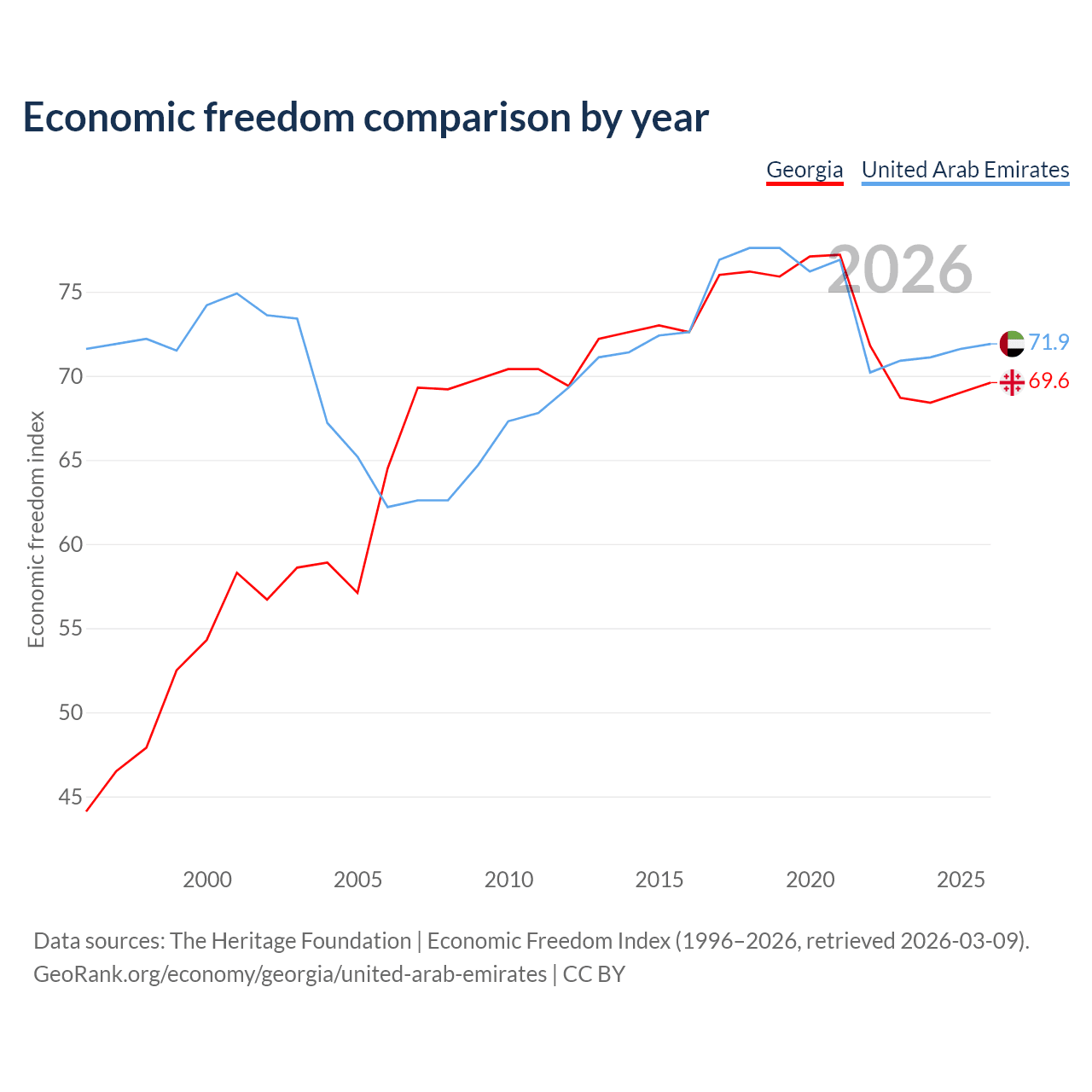 The Economic Freedom Index for Georgia is 69.6, ranking 41/197, compared to 71.9 for the United Arab Emirates, ranking 29/197. The chart above displays a comparison of annual changes in economic freedom indexes.