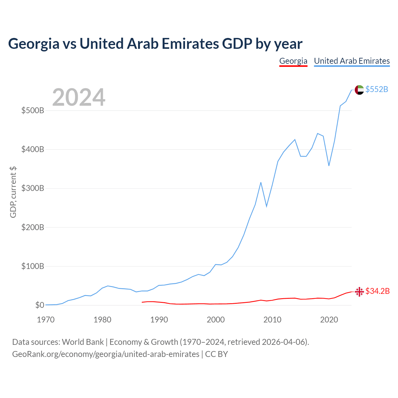 Georgia has a GDP of $34.2B compared to $552B for the United Arab Emirates, ranking 107/197 and 27/197 by economy size, respectively.