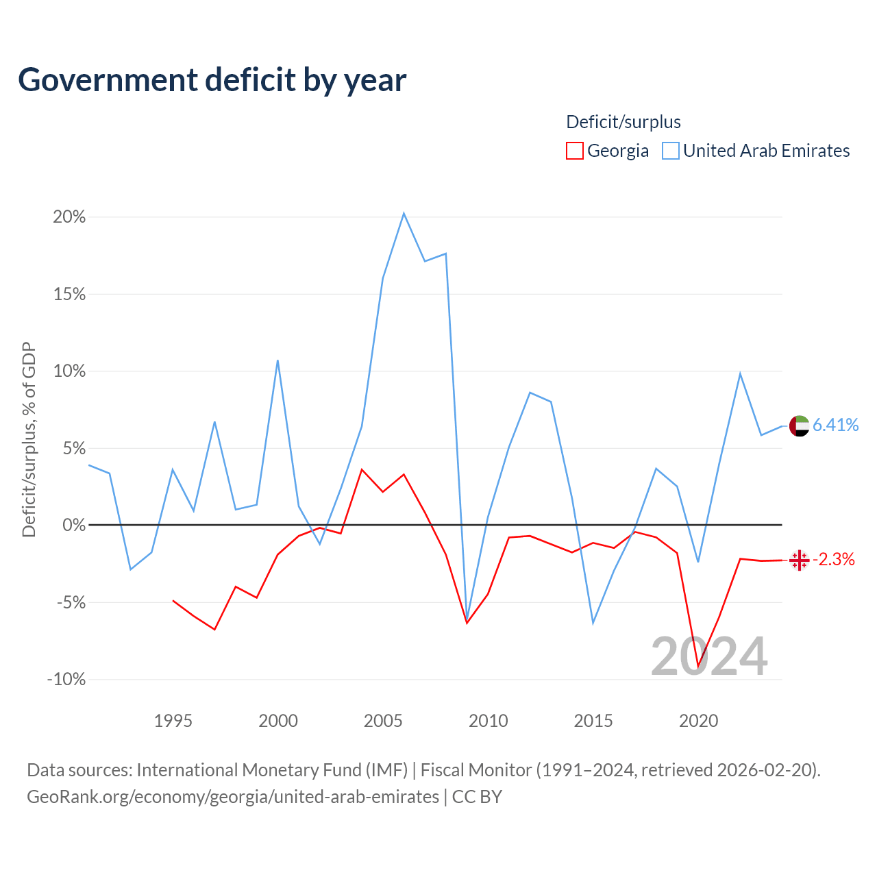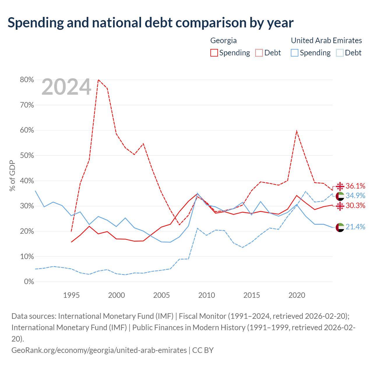 Georgia has $12.3B in government debt (36.1% of GDP), compared to $193B (34.9% of GDP) in the United Arab Emirates.