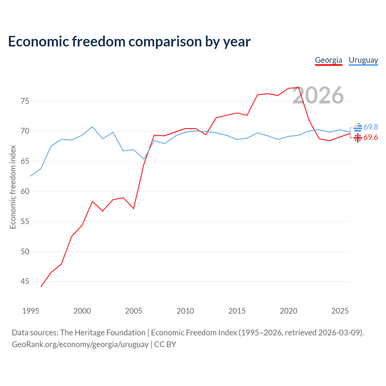 The Economic Freedom Index for Georgia is 69.6, ranking 41/197, compared to 69.8 for Uruguay, ranking 39/197. The chart above displays a comparison of annual changes in economic freedom indexes.