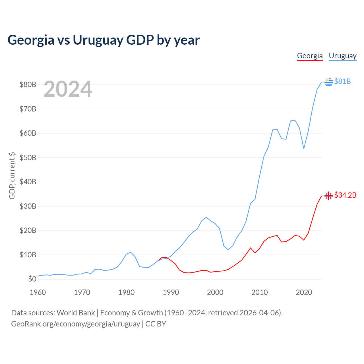 Georgia has a GDP of $34.2B compared to $81B for Uruguay, ranking 107/197 and 81/197 by economy size, respectively.
