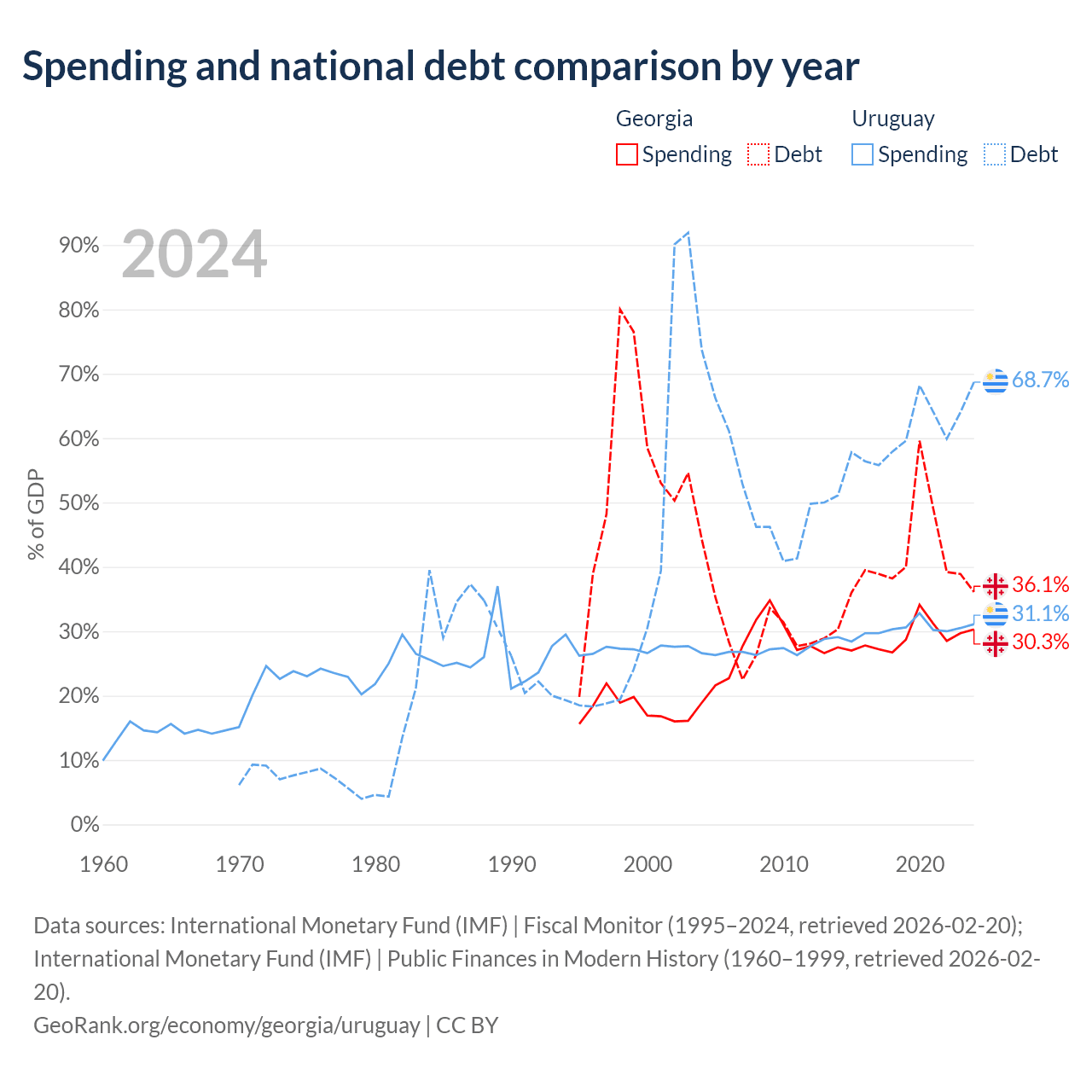 Georgia has $12.3B in government debt (36.1% of GDP), compared to $55.6B (68.7% of GDP) in Uruguay.