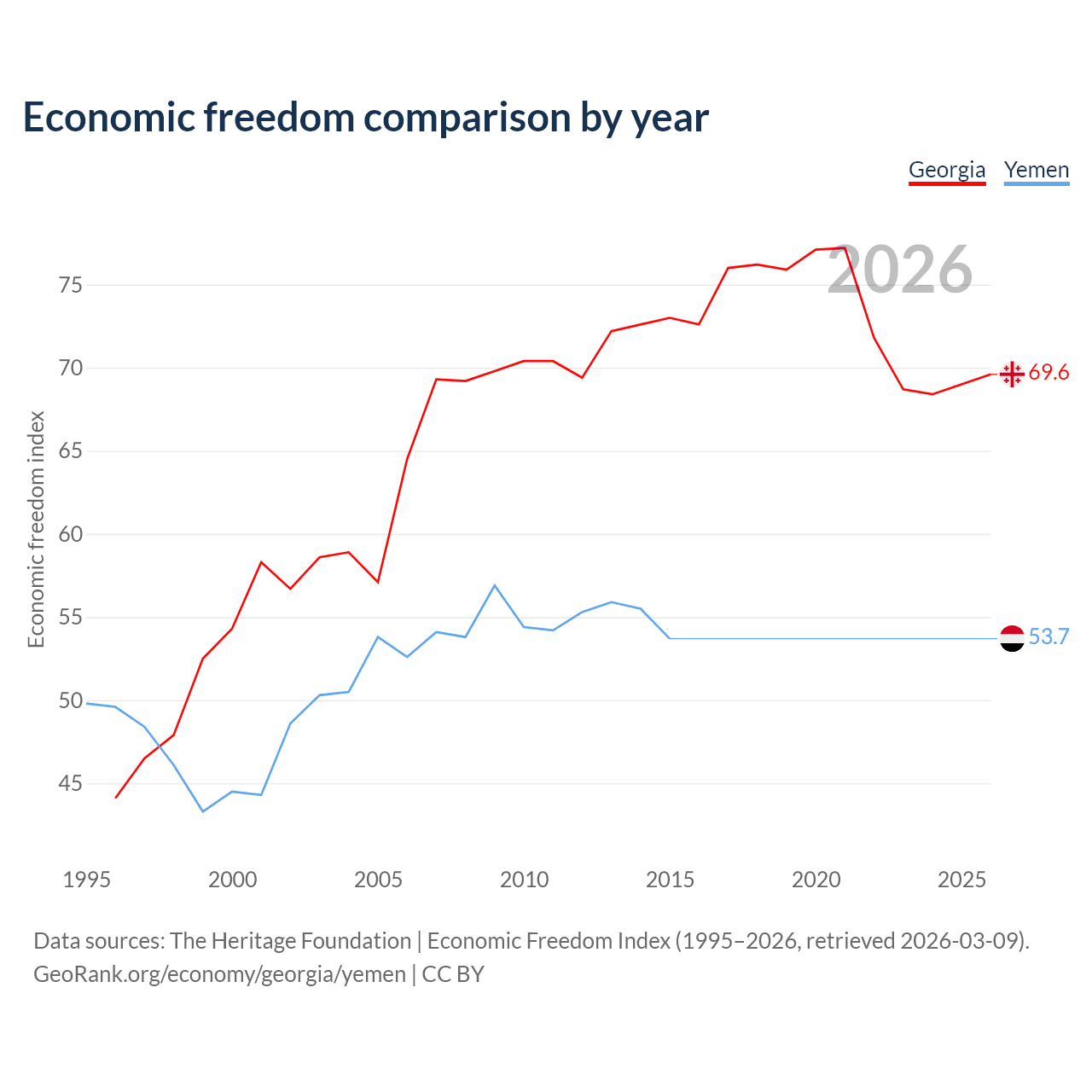 The Economic Freedom Index for Georgia is 69.6, ranking 41/197, compared to 53.7 for Yemen, ranking 138/197. The chart above displays a comparison of annual changes in economic freedom indexes.