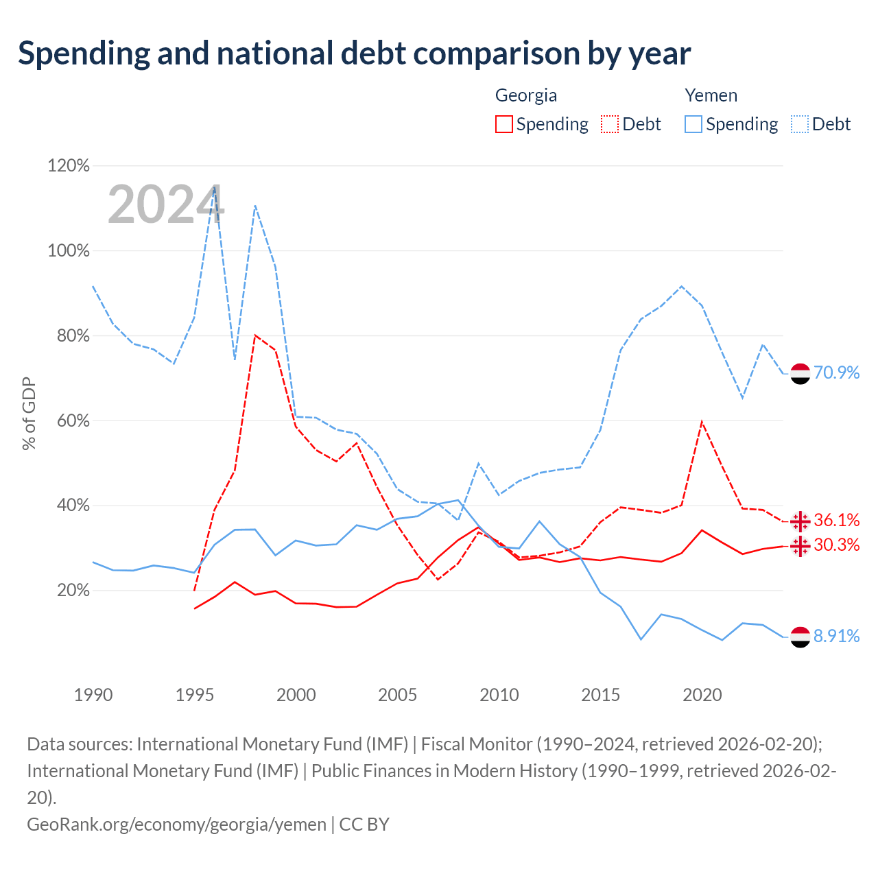 Georgia has $12.3B in government debt (36.1% of GDP), compared to $18.8B (70.9% of GDP) in Yemen.