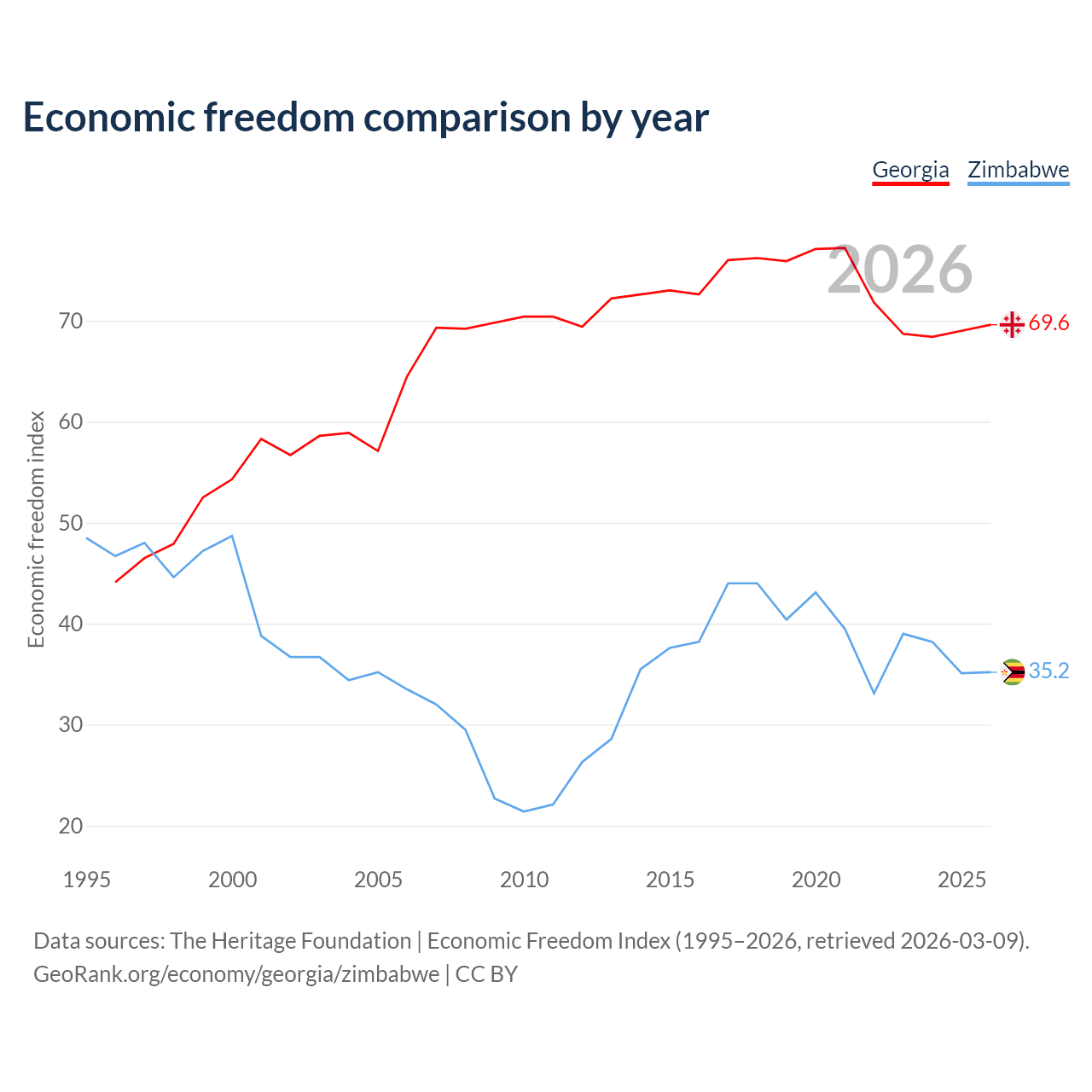 The Economic Freedom Index for Georgia is 69.6, ranking 41/197, compared to 35.2 for Zimbabwe, ranking 190/197. The chart above displays a comparison of annual changes in economic freedom indexes.