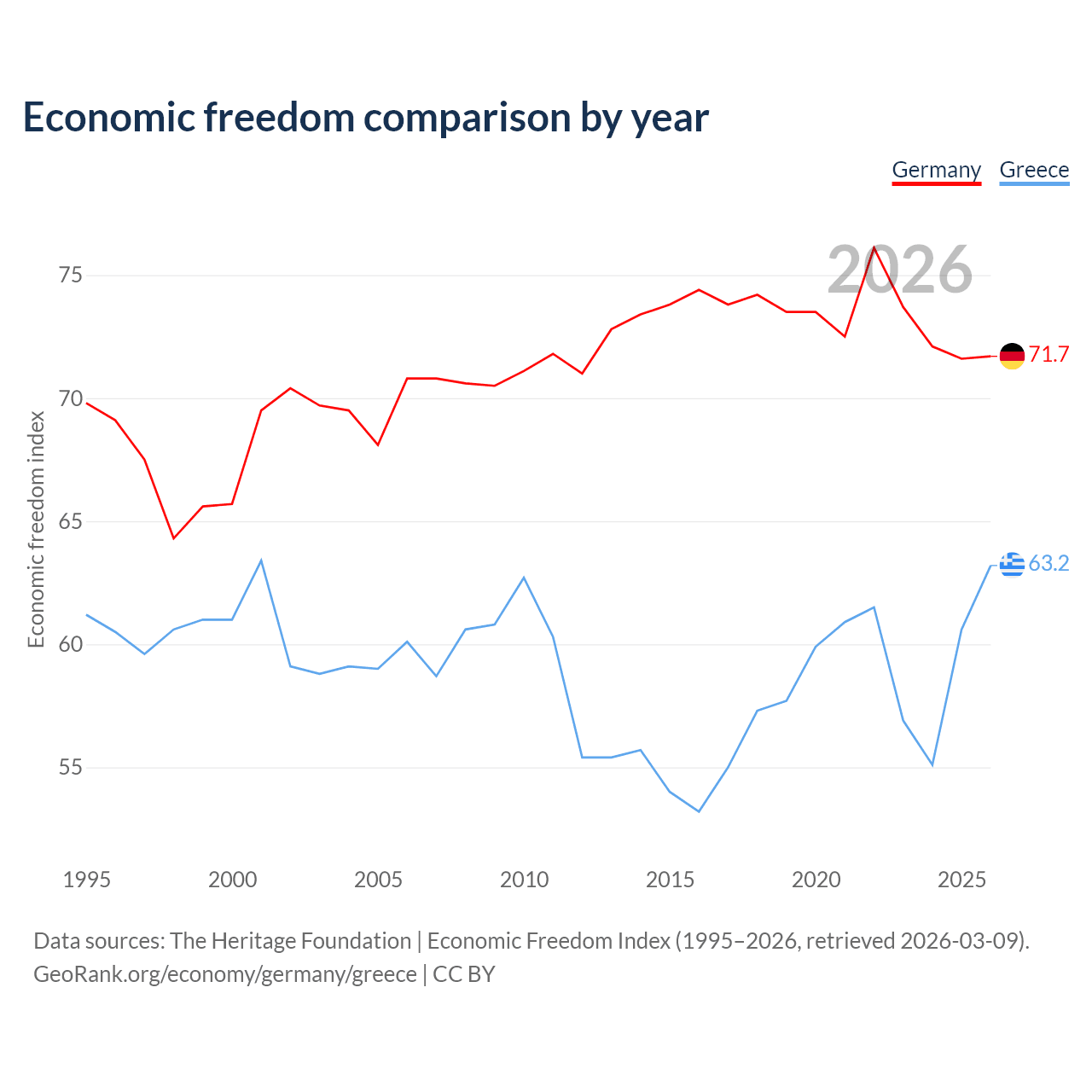 The Economic Freedom Index for Germany is 71.7, ranking 30/197, compared to 63.2 for Greece, ranking 82/197. The chart above displays a comparison of annual changes in economic freedom indexes.