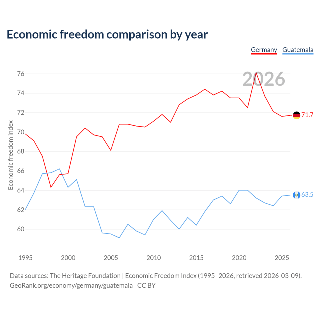 The Economic Freedom Index for Germany is 71.7, ranking 30/197, compared to 63.5 for Guatemala, ranking 79/197. The chart above displays a comparison of annual changes in economic freedom indexes.