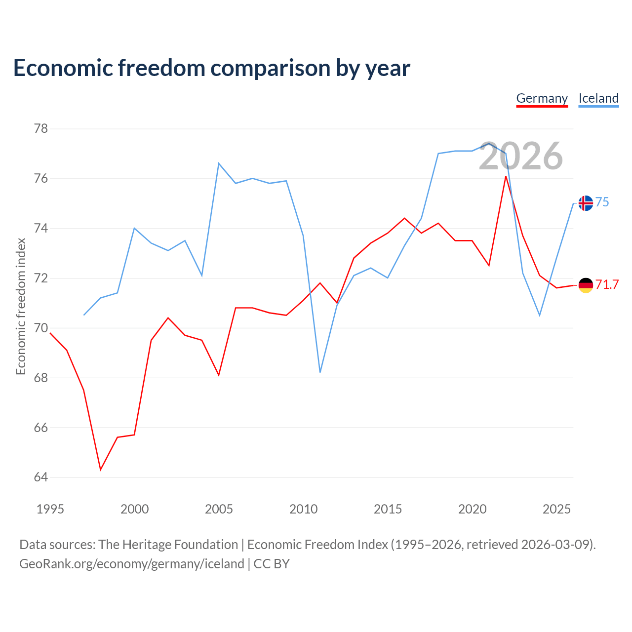 The Economic Freedom Index for Germany is 71.7, ranking 30/197, compared to 75 for Iceland, ranking 19/197. The chart above displays a comparison of annual changes in economic freedom indexes.