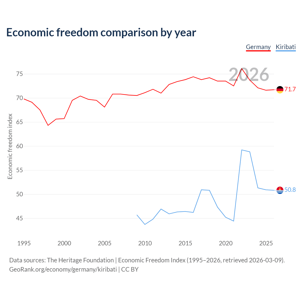 The Economic Freedom Index for Germany is 71.7, ranking 30/197, compared to 50.8 for Kiribati, ranking 158/197. The chart above displays a comparison of annual changes in economic freedom indexes.