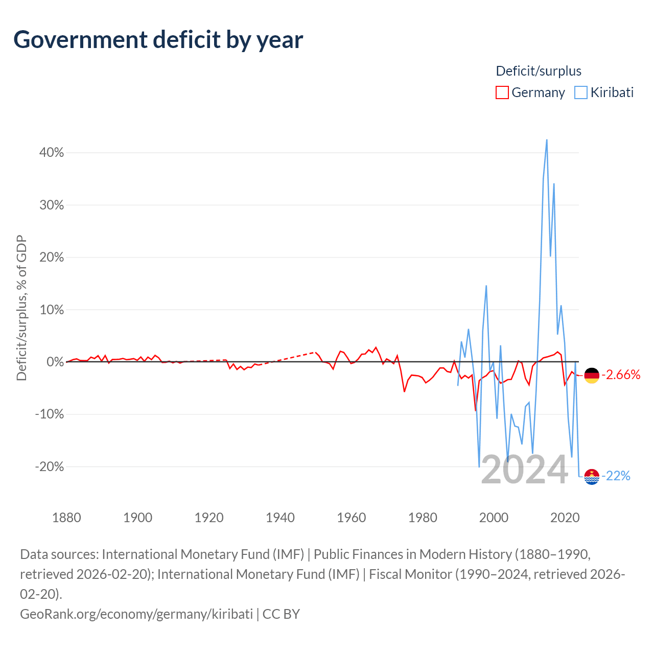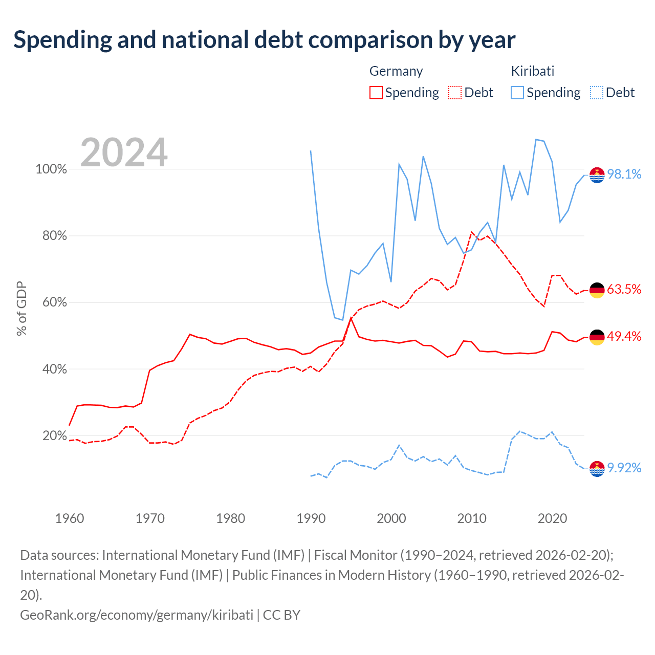 Germany has $2.97T in government debt (63.5% of GDP), compared to $30.5M (9.92% of GDP) in Kiribati.