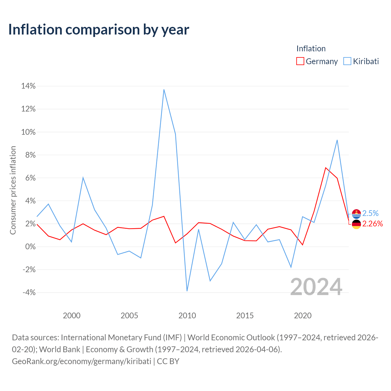 Germany has a GDP of $4.69T compared to $308M for Kiribati, ranking 3/197 and 192/197 by economy size, respectively.