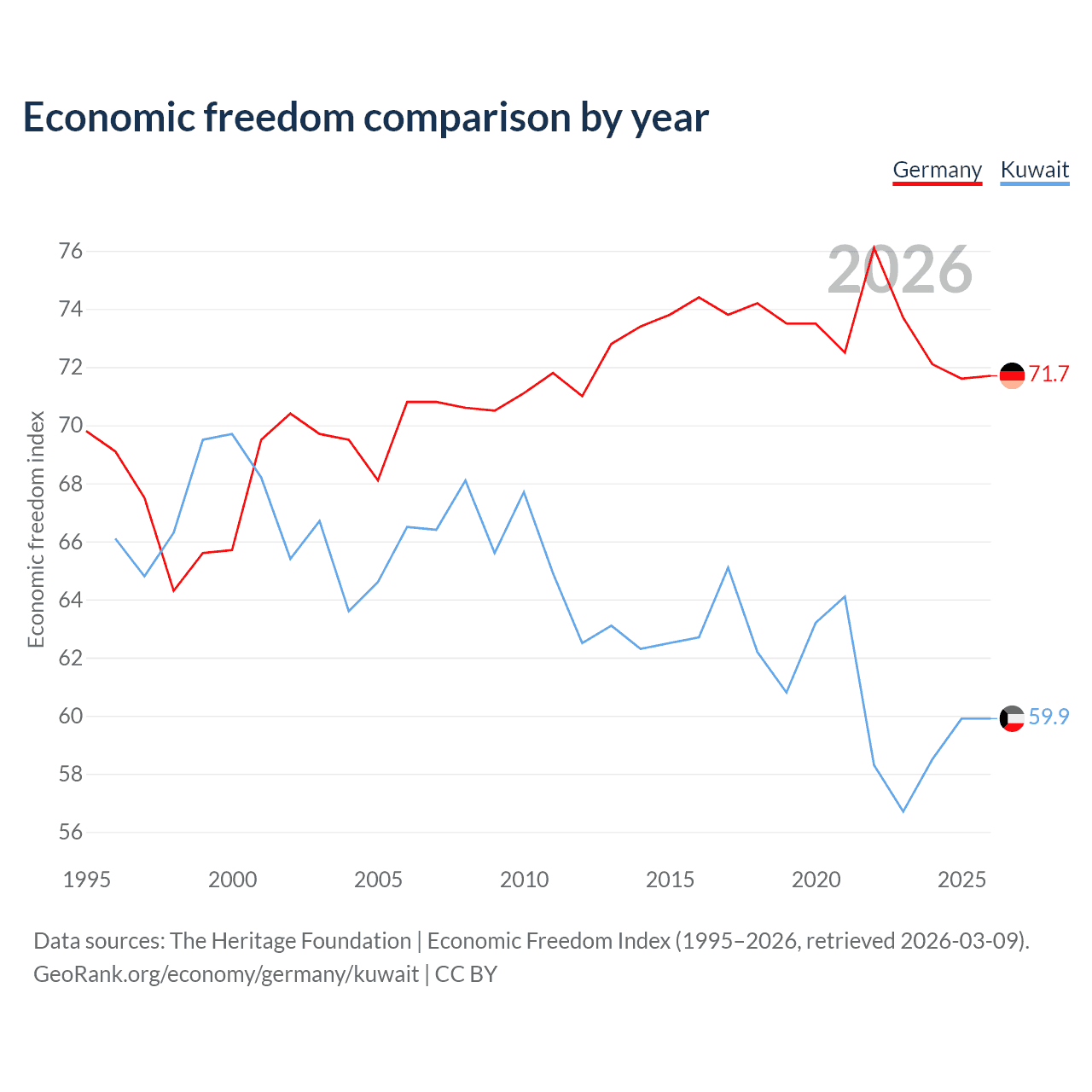 The Economic Freedom Index for Germany is 71.7, ranking 30/197, compared to 59.9 for Kuwait, ranking 100/197. The chart above displays a comparison of annual changes in economic freedom indexes.