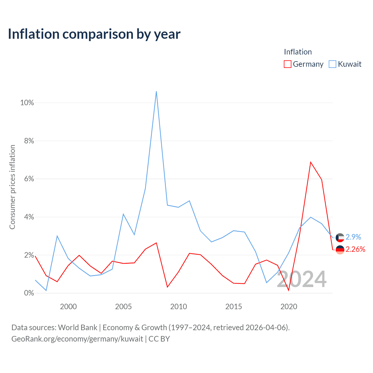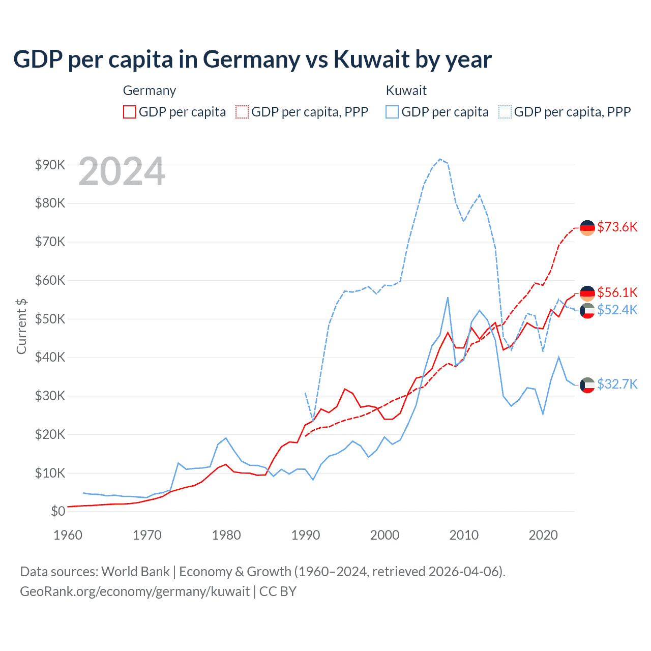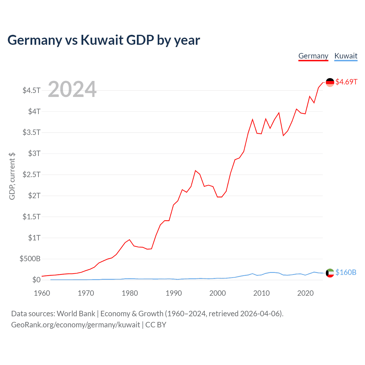 Germany has a GDP of $4.69T compared to $160B for Kuwait, ranking 3/197 and 59/197 by economy size, respectively.