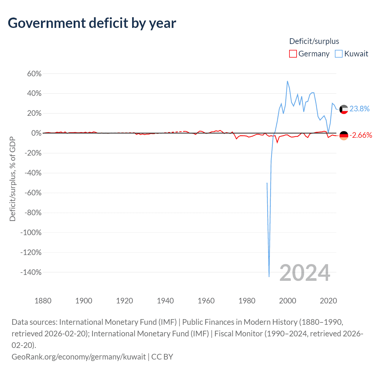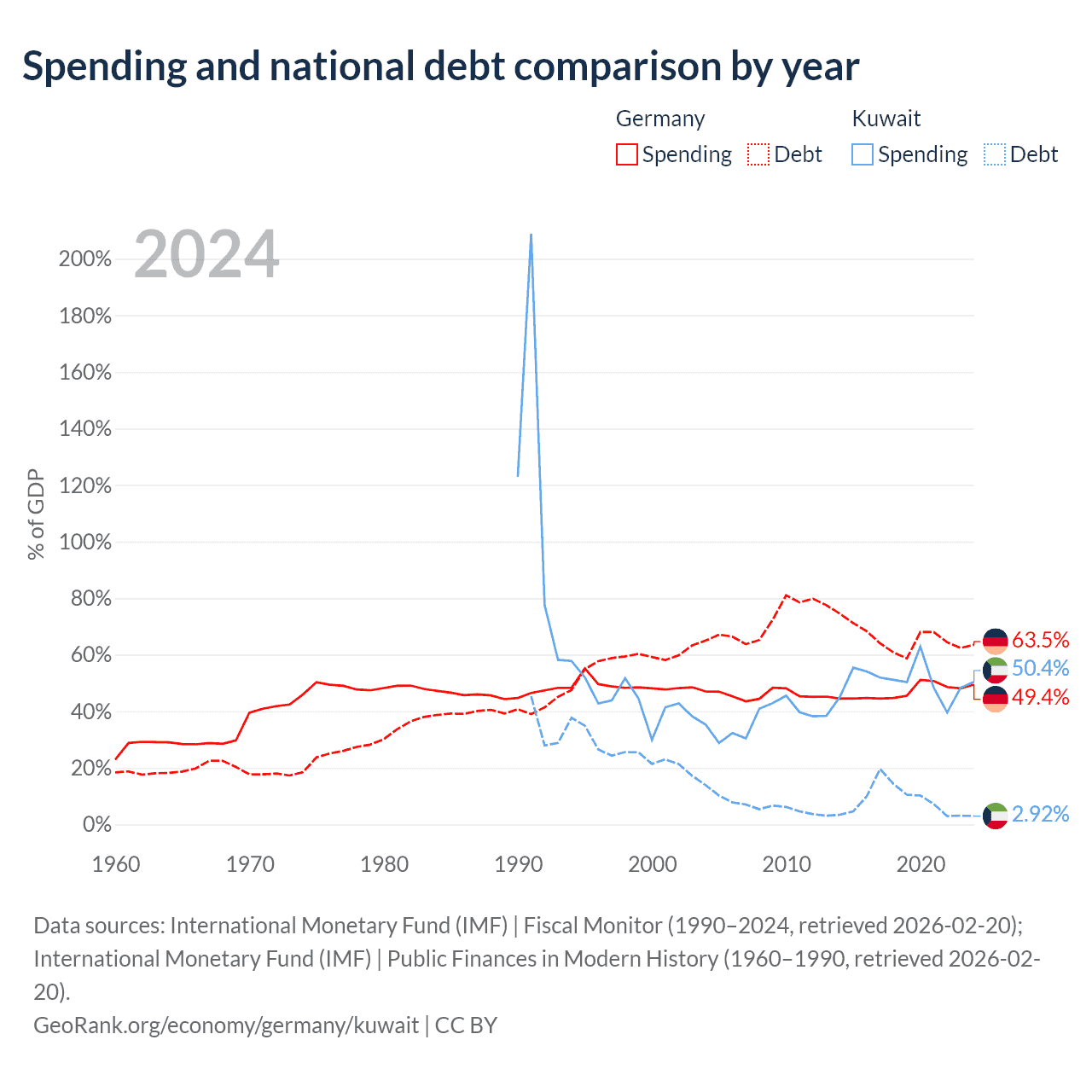 Germany has $2.97T in government debt (63.5% of GDP), compared to $4.68B (2.92% of GDP) in Kuwait.