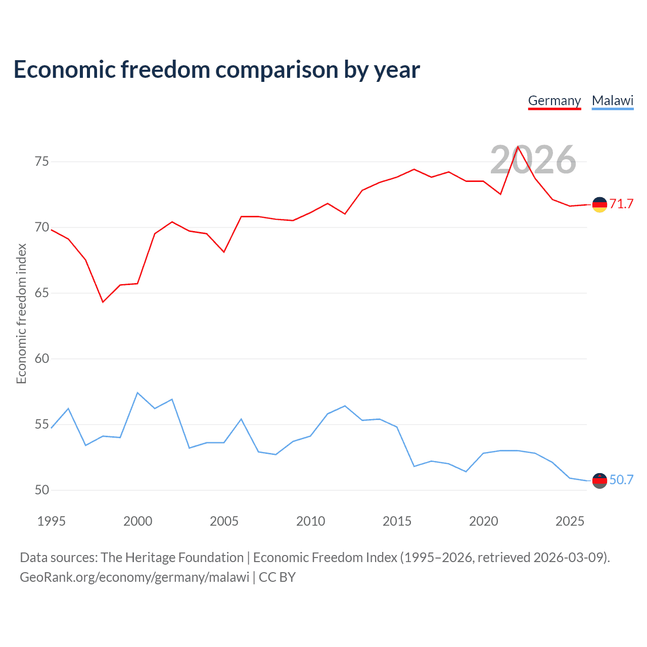 The Economic Freedom Index for Germany is 71.7, ranking 30/197, compared to 50.7 for Malawi, ranking 159/197. The chart above displays a comparison of annual changes in economic freedom indexes.