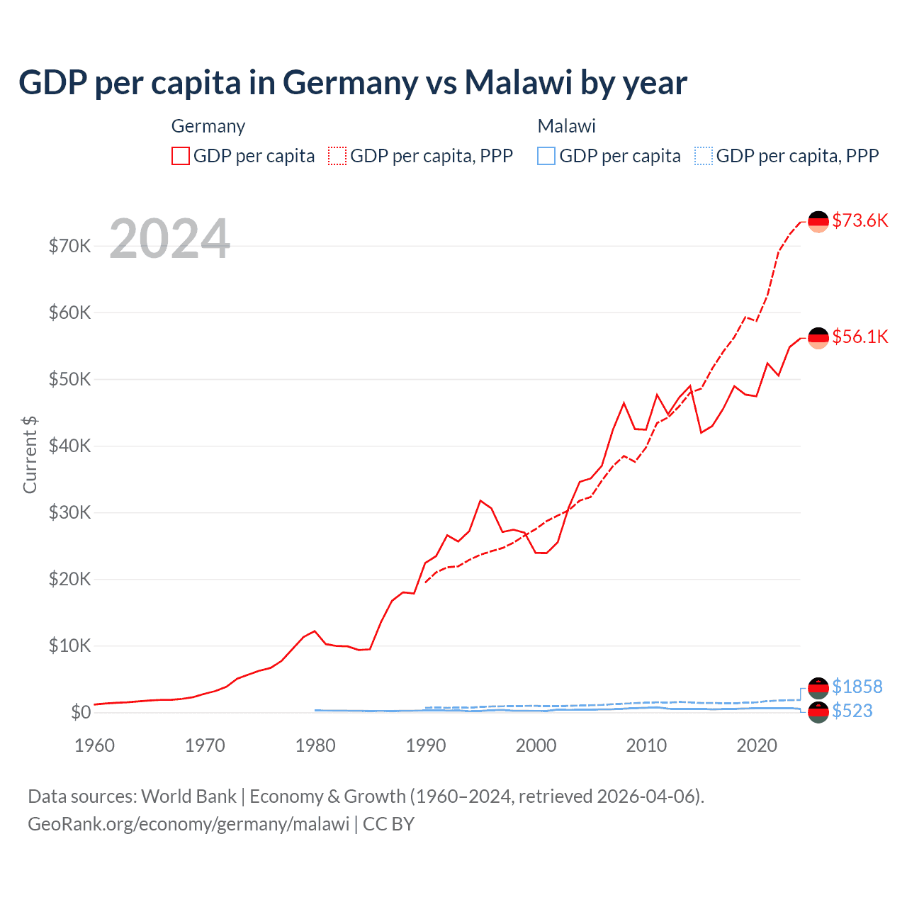 GDP per capita in Germany vs Malawi by year
