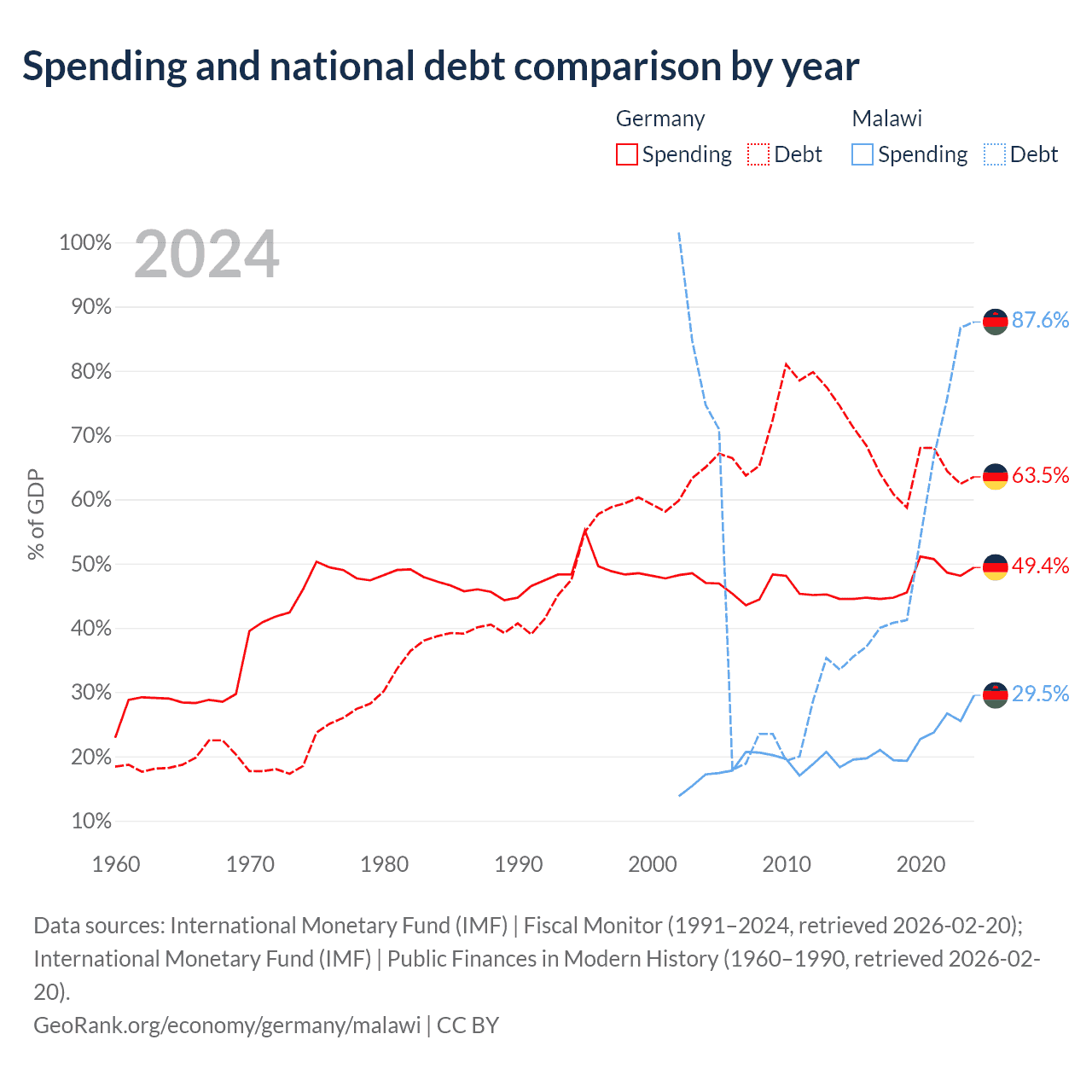 Germany has $2.97T in government debt (63.5% of GDP), compared to $9.91B (87.6% of GDP) in Malawi.