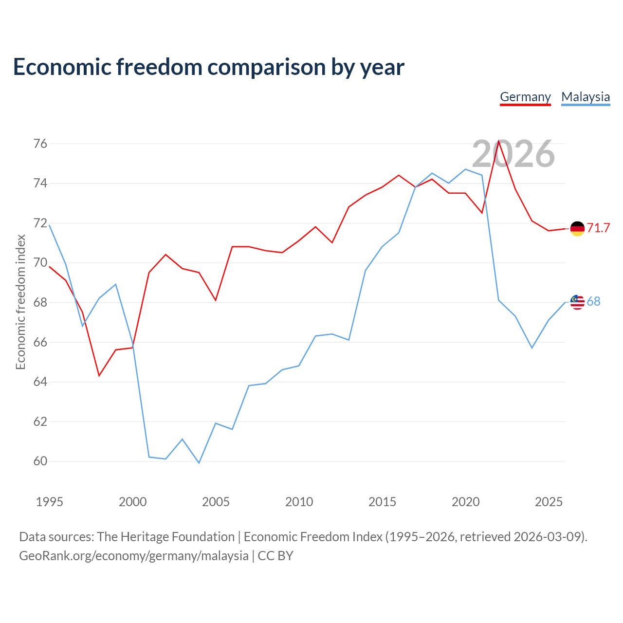 The Economic Freedom Index for Germany is 71.7, ranking 30/197, compared to 68 for Malaysia, ranking 51/197. The chart above displays a comparison of annual changes in economic freedom indexes.
