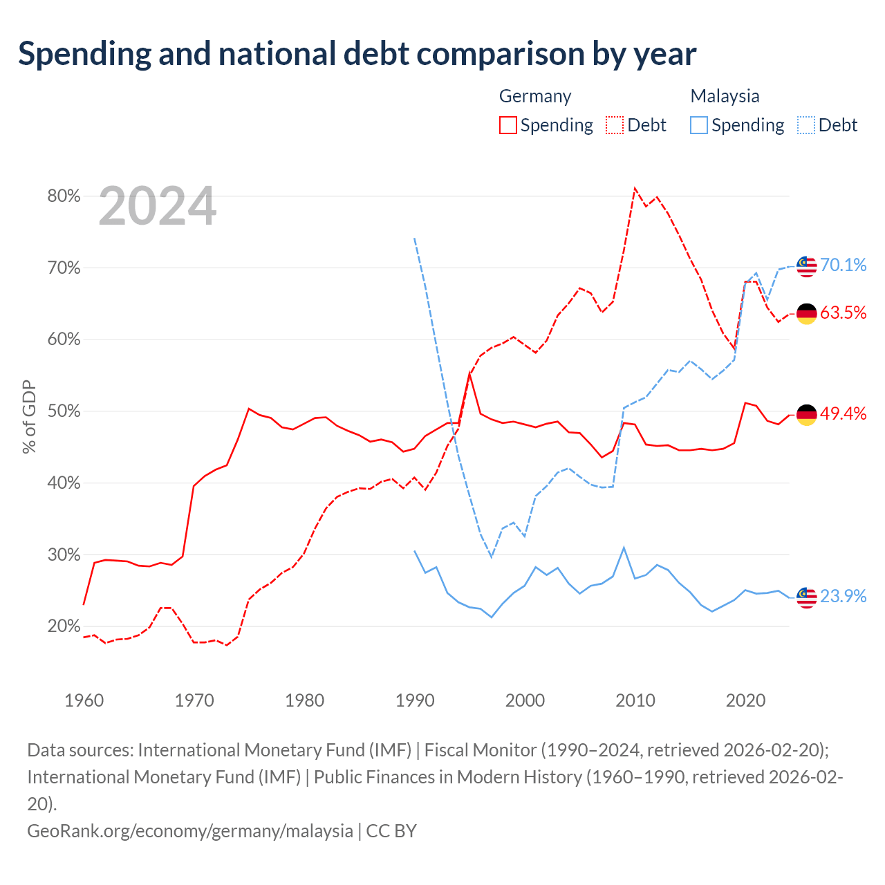Germany has $2.97T in government debt (63.5% of GDP), compared to $296B (70.1% of GDP) in Malaysia.