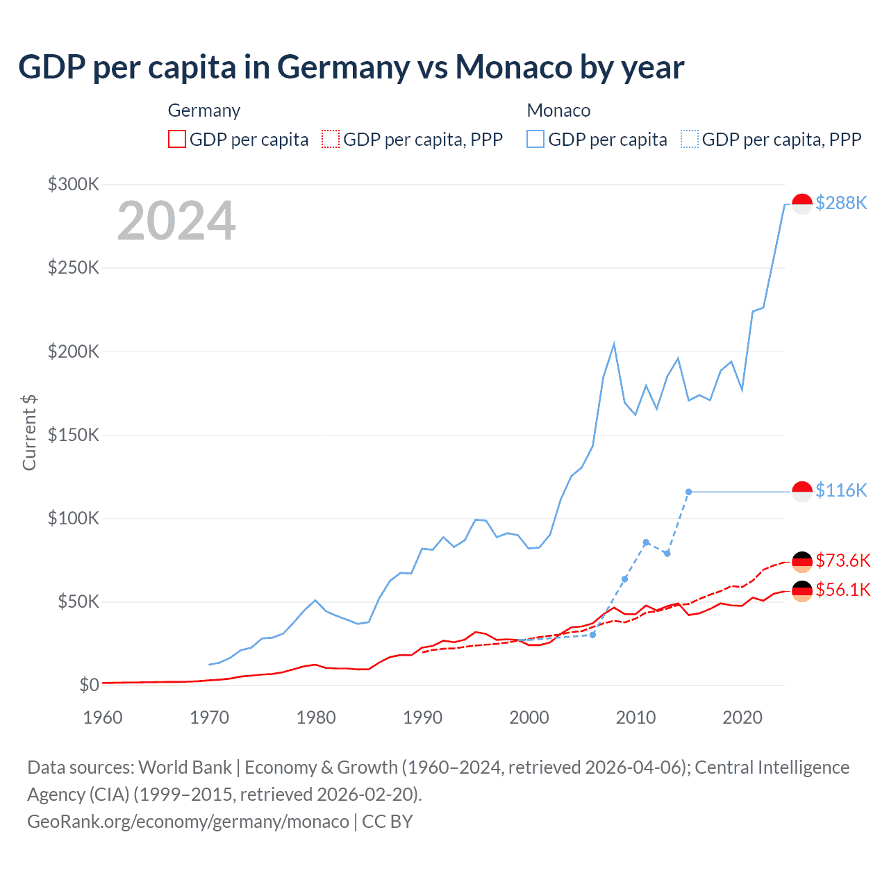 Germany has a GDP of $4.69T compared to $11.1B for Monaco, ranking 3/197 and 152/197 by economy size, respectively.