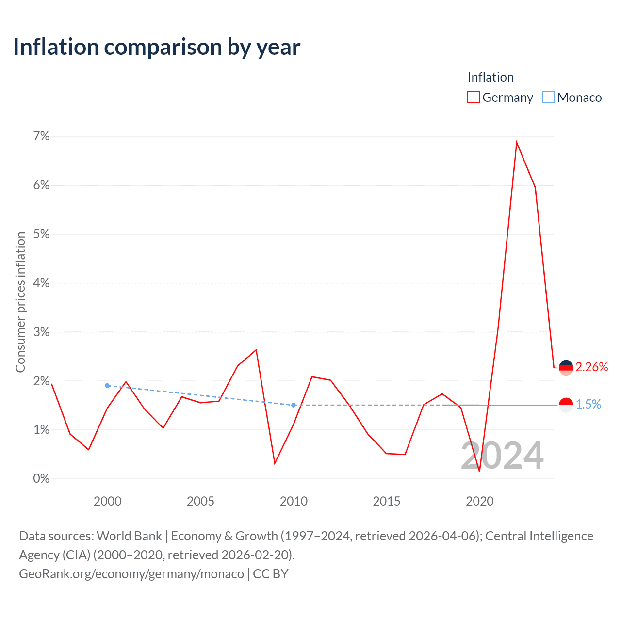 Over the past 21 years, Germany has recorded an average annual inflation rate of 1.4%, compared with 1.58% in Monaco. In 2020, inflation was 2.26% in Germany and 1.5% in Monaco.