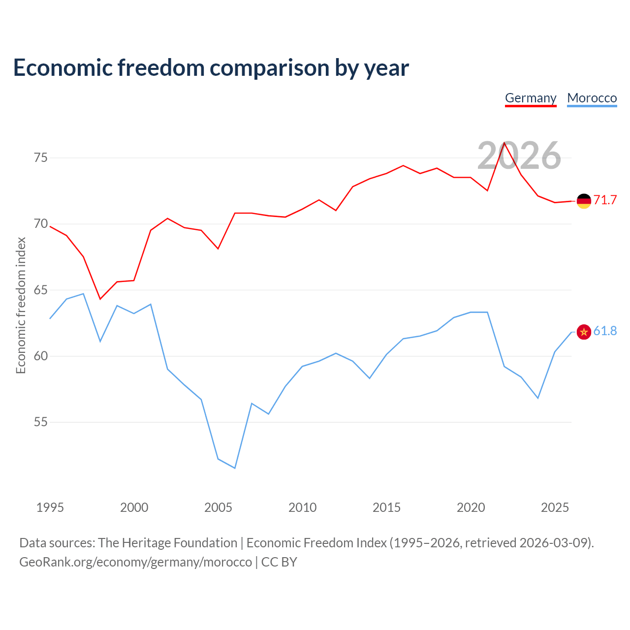 The Economic Freedom Index for Germany is 71.7, ranking 30/197, compared to 61.8 for Morocco, ranking 91/197. The chart above displays a comparison of annual changes in economic freedom indexes.