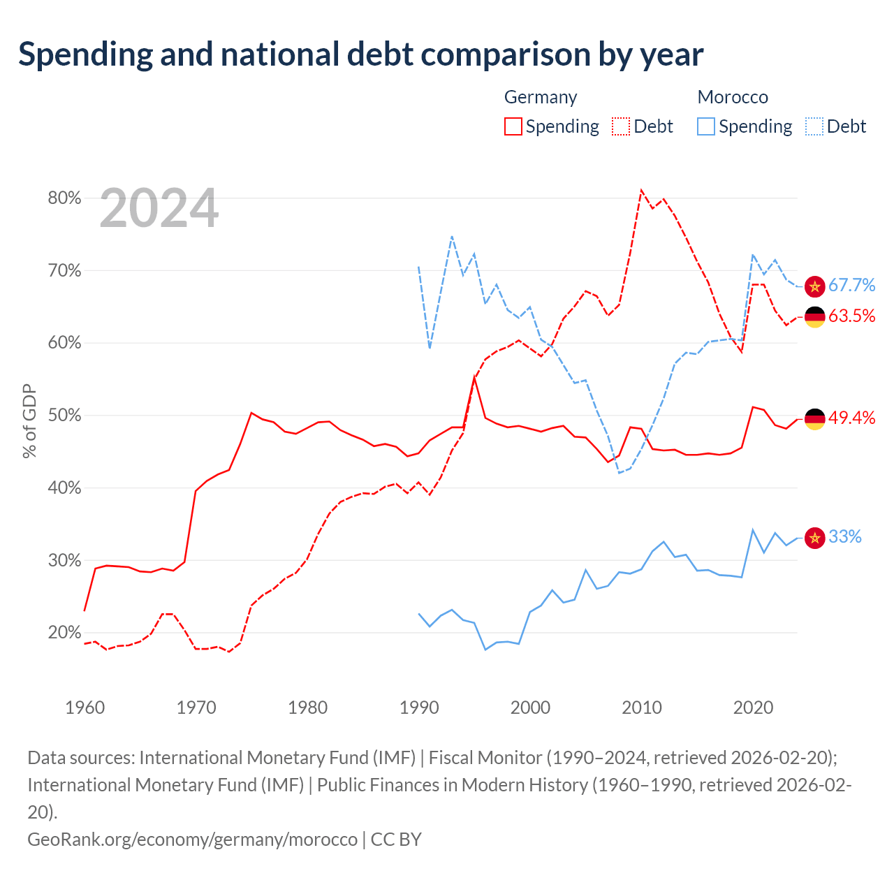 Germany has $2.97T in government debt (63.5% of GDP), compared to $109B (67.7% of GDP) in Morocco.
