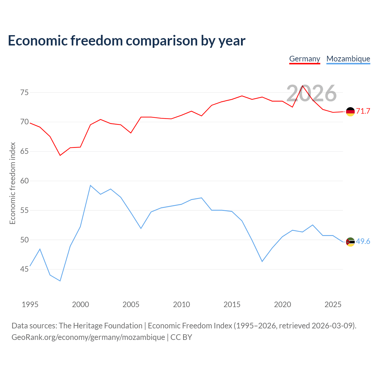 The Economic Freedom Index for Germany is 71.7, ranking 30/197, compared to 49.6 for Mozambique, ranking 164/197. The chart above displays a comparison of annual changes in economic freedom indexes.