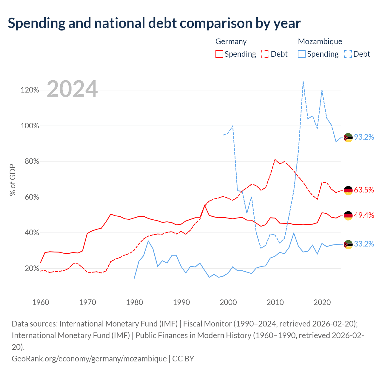 Germany has $2.97T in government debt (63.5% of GDP), compared to $21.2B (93.2% of GDP) in Mozambique.