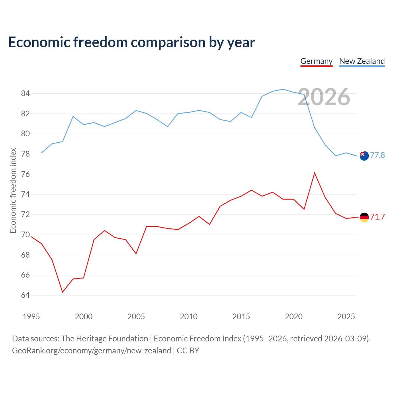 The Economic Freedom Index for Germany is 71.7, ranking 30/197, compared to 77.8 for New Zealand, ranking 13/197. The chart above displays a comparison of annual changes in economic freedom indexes.