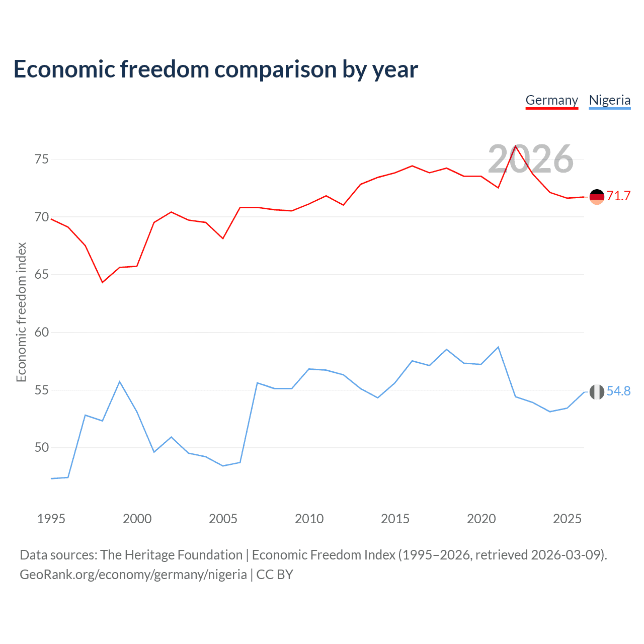 The Economic Freedom Index for Germany is 71.7, ranking 30/197, compared to 54.8 for Nigeria, ranking 132/197. The chart above displays a comparison of annual changes in economic freedom indexes.