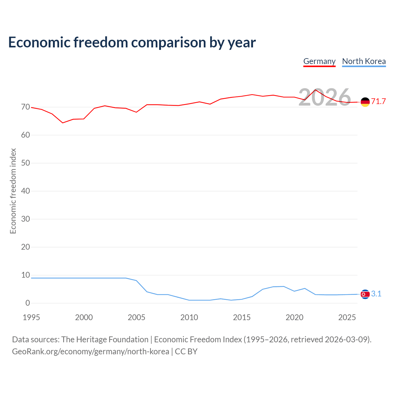 The Economic Freedom Index for Germany is 71.7, ranking 30/197, compared to 3.1 for North Korea, ranking 197/197. The chart above displays a comparison of annual changes in economic freedom indexes.