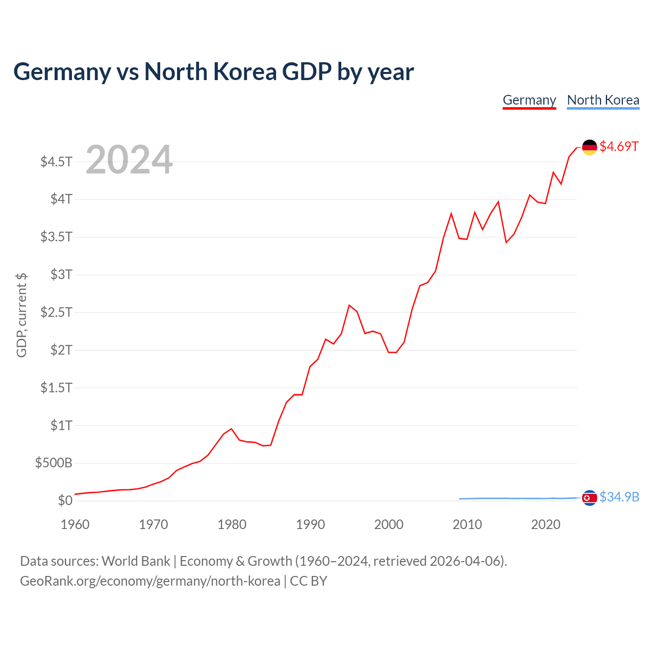 Germany has a GDP of $4.69T compared to $34.9B for North Korea, ranking 3/197 and 106/197 by economy size, respectively.
