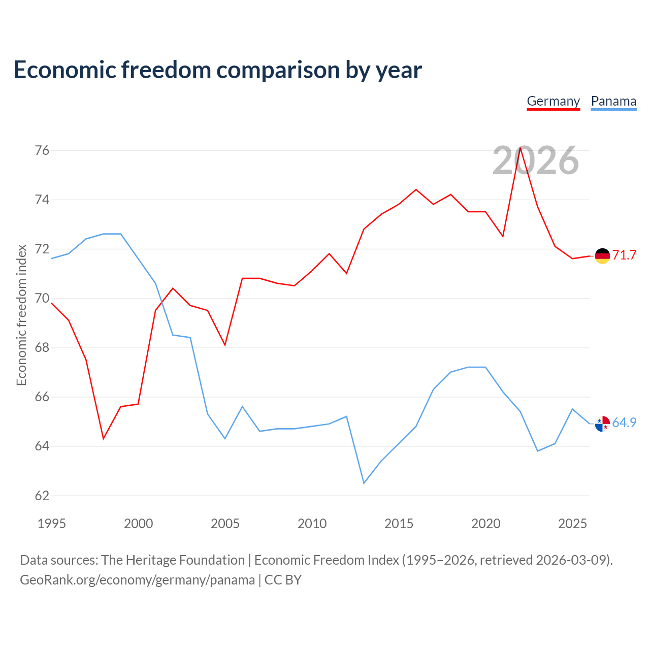 The Economic Freedom Index for Germany is 71.7, ranking 30/197, compared to 64.9 for Panama, ranking 70/197. The chart above displays a comparison of annual changes in economic freedom indexes.
