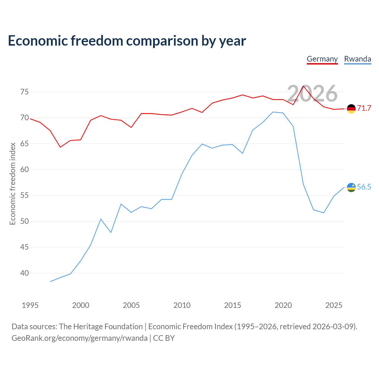 The Economic Freedom Index for Germany is 71.7, ranking 30/197, compared to 56.5 for Rwanda, ranking 121/197. The chart above displays a comparison of annual changes in economic freedom indexes.