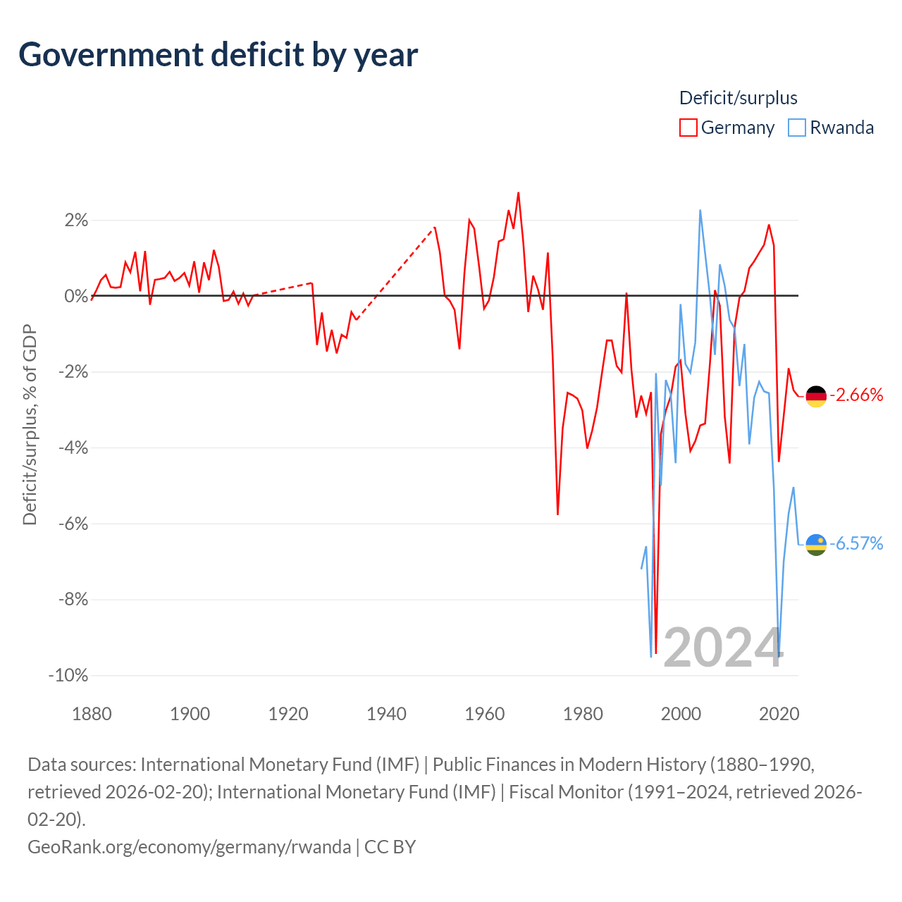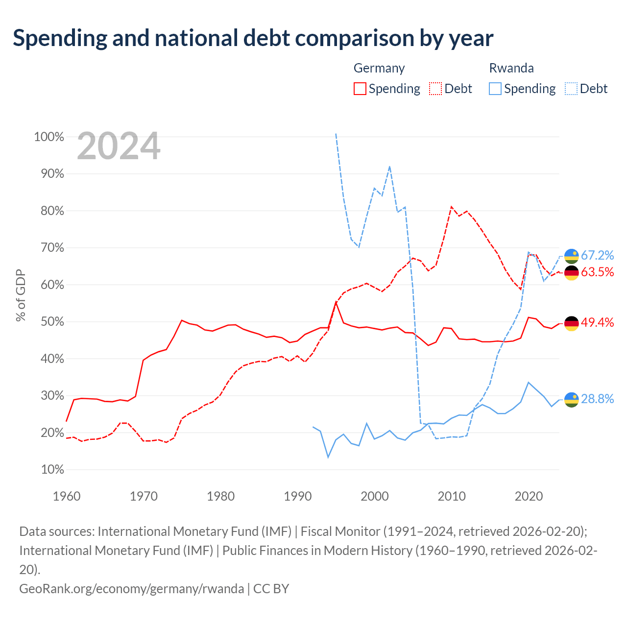 Germany has $2.97T in government debt (63.5% of GDP), compared to $9.58B (67.2% of GDP) in Rwanda.